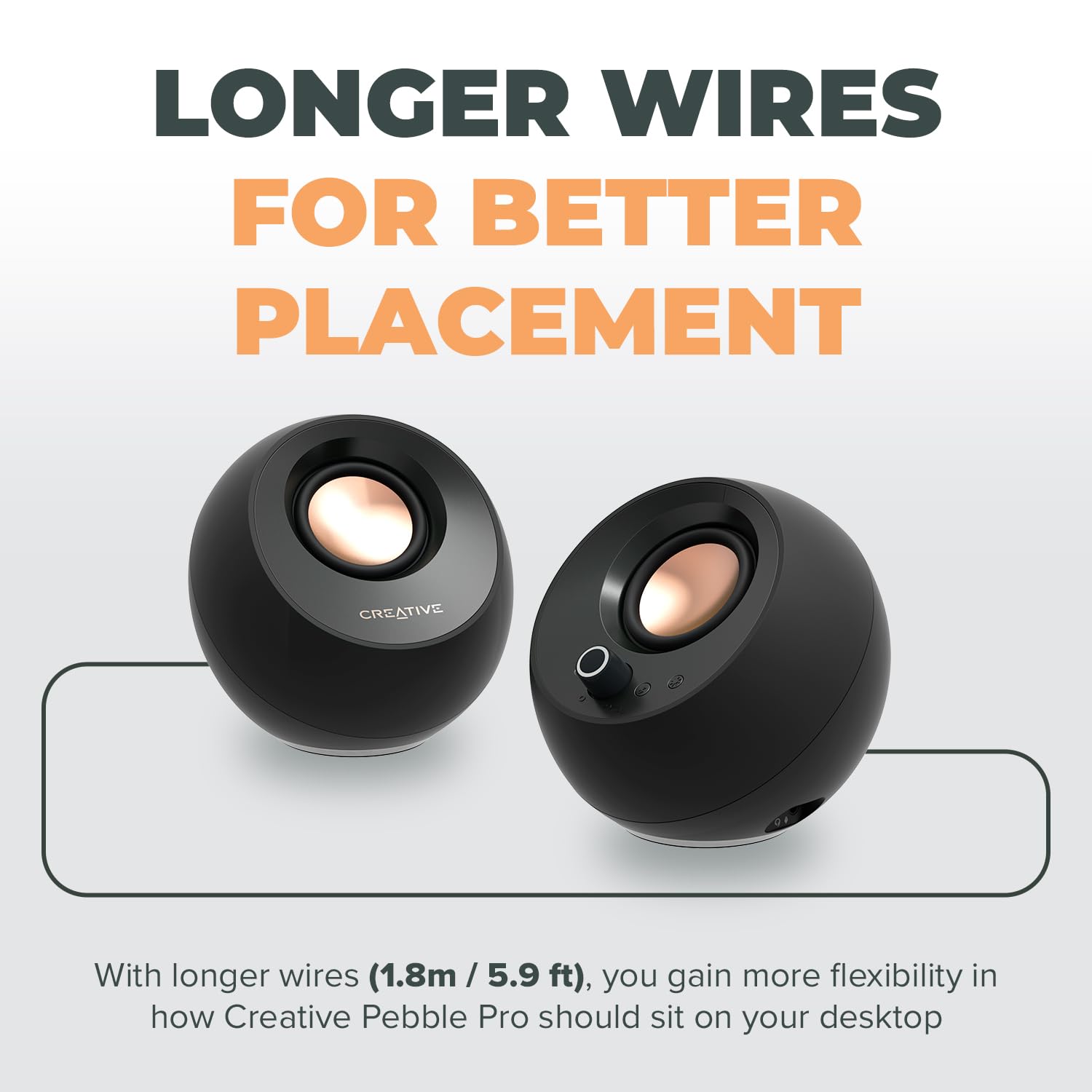 Now with customizable RGB lighting! The Creative Pebble Pro speakers let you pick from a selection of RGB LED colors and three lighting effects via a simple plug-and-play setup.
