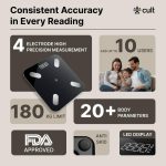 [Advanced Body Composition Monitoring] – Stay on top of your health with the cult smart scale, which tracks over 20 vital body metrics, including Weight, Body Mass Index (BMI), Visceral Fat, Lean Body Mass, Muscle Mass, Bone Mass, Basal Metabolic Rate (BMR), Body Age, and more.
