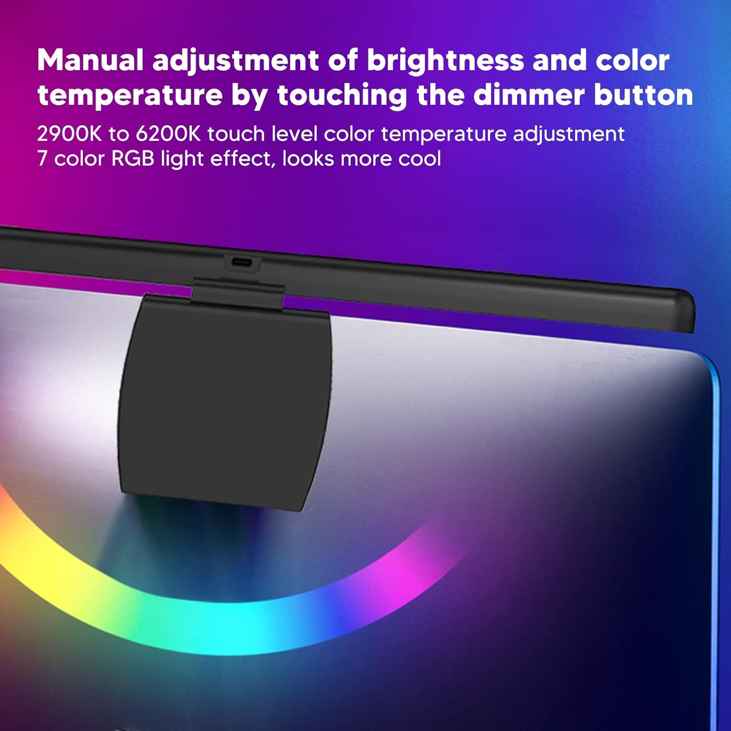 Touch Dimming Our desktop screen lamp allows you to manually adjust the brightness and color temperature by touching the dimming setting. You can choose between 2900K and 6200K three-step color temperature setting and switch between cold and warm light as you like. With 7 color RGB light effects, it adds a cool touch to your workspace.