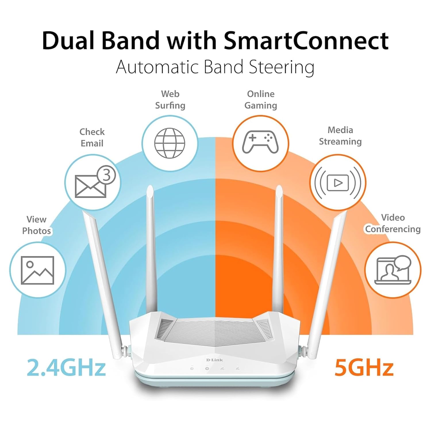 Wi-Fi 6 AX 1500 Mbps WAVE 2 Dual band wireless router with 4 high gain Omni Antenna Gigabit Ports — One Gigabit WAN & Three Gigabit LAN ports for high speed wired connectivity. Easy Setup: Super simple set-up with the D-Link Eagle Pro AI Mobile APP Or with intuitive WEB GUI setup wizard. D-Link AI Technology: AI Mesh Optimizer, AI Wi-Fi Optimizer, AI Traffic Optimizer, AI Parental Controls;D-Link Easy Mesh Support, Can create a mesh network of 1+3 devices.; 3 Year Warranty. Supports WPA, WPA2, and the latest WPA3 Wi-fi Security Security Protocol: Wpa2-Psk
