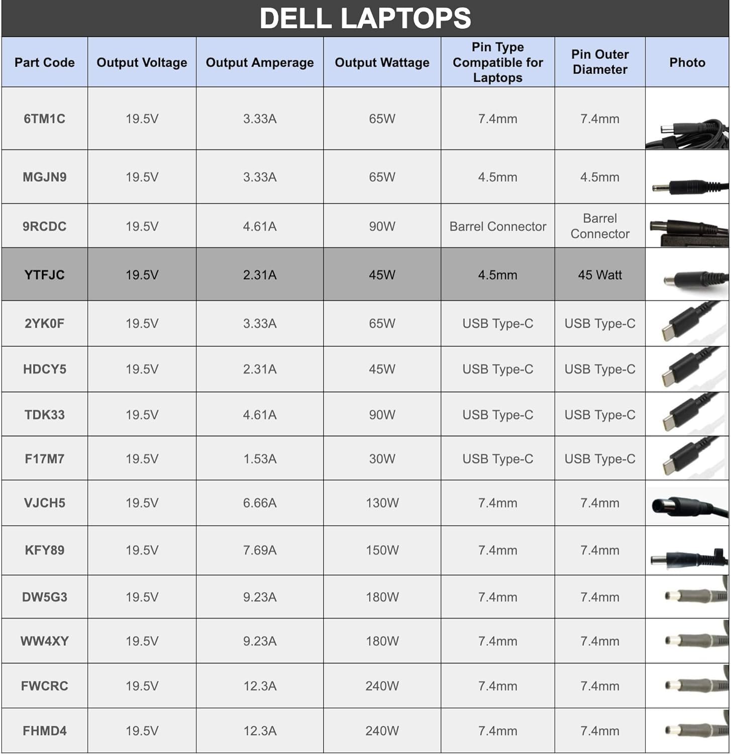 The Dell 4.5mm pin laptop adapter comes with 45W output power and output current 2.31A. This 19.5V adapter is specially designed to meet the power needs of your Dell laptop or Tablet.