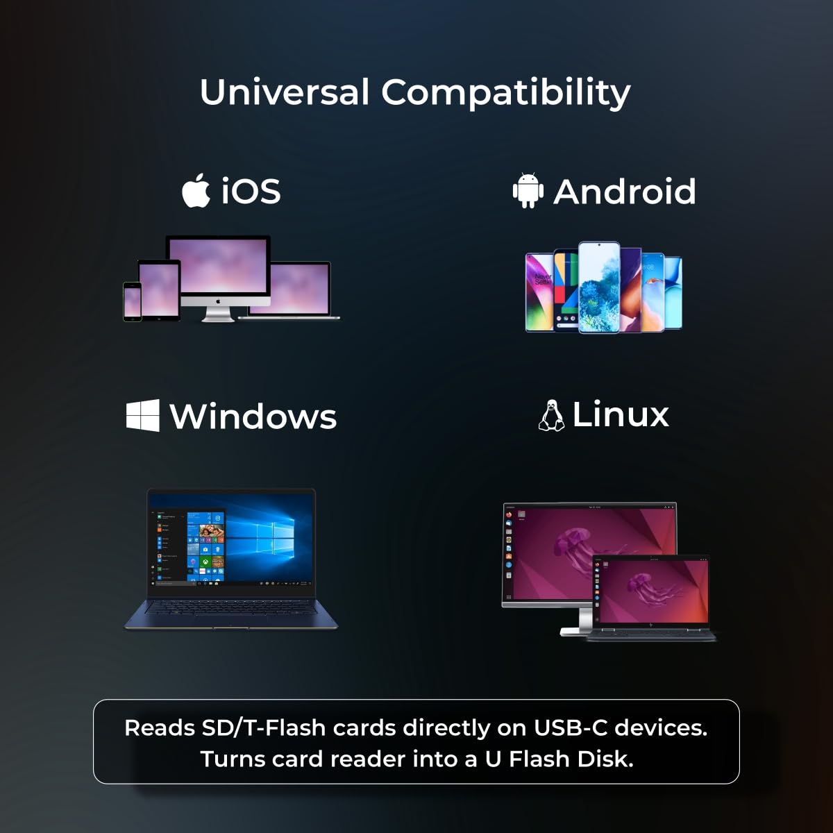 TYPE C OTG SUPPPORT: Provides OTG (On-The-Go) functionality, allowing direct reading of SD and T-Flash cards on USB C and OTG-supported devices without the need for additional adapters.