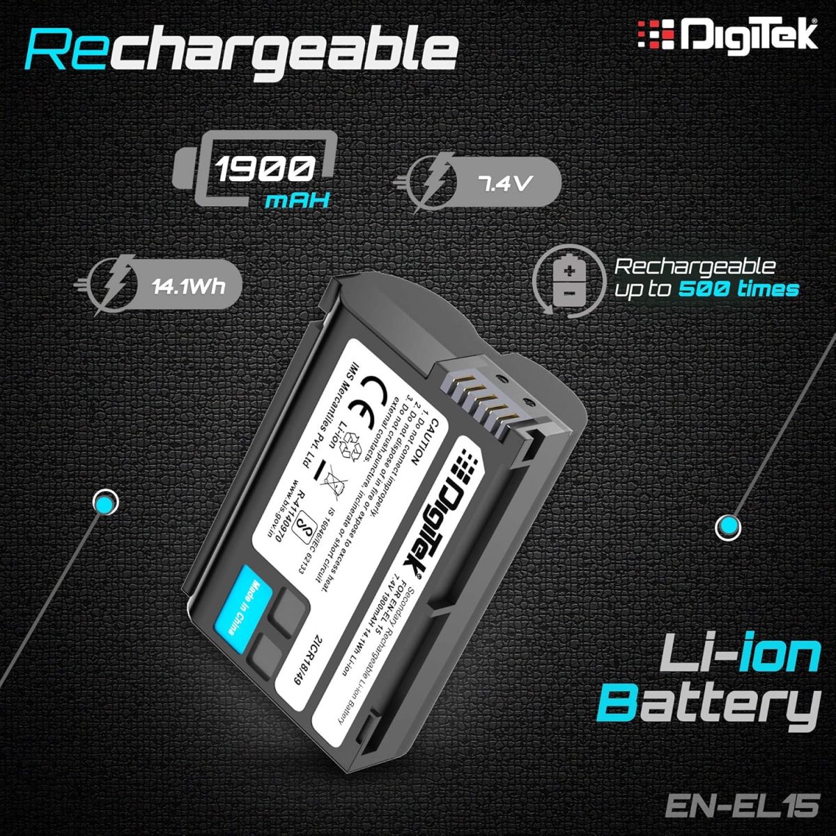 DIGITEK® (EN-EL15) Secondary Rechargeable Battery Packs for Digital Camera EN-EL15, Compatibility – D7000, D7100, D7200, D850, D750, D810, D500, D600, D610, D7500, D800, D800E, & V1