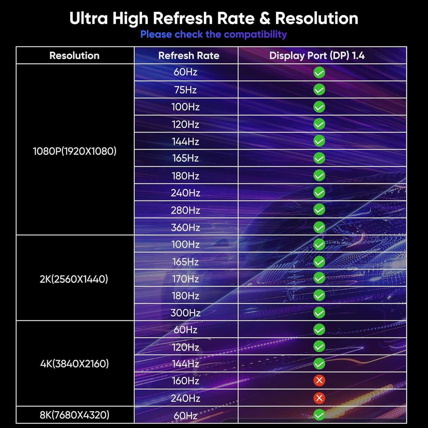 【8K@60Hz Super Resolution】 DteeDck displayport 1.4 cable supports high resolution 8K(7680×4320)@60Hz, 5K(5120×2880)@60Hz, 4K@144Hz, 2K@240Hz, 1080P@240Hz, etc. High resolution makes the picture clearer. Backward compatible with DisplayPort 1.3/1.2/1.1 and 1.0. 8K Displayport Cable 1.4 works fully with FreeSync and G-Sync. Plug and Play. Also supports flawless audio pass-through in 7.1,5.1 and 2.0 uncompressed digital audio channels.