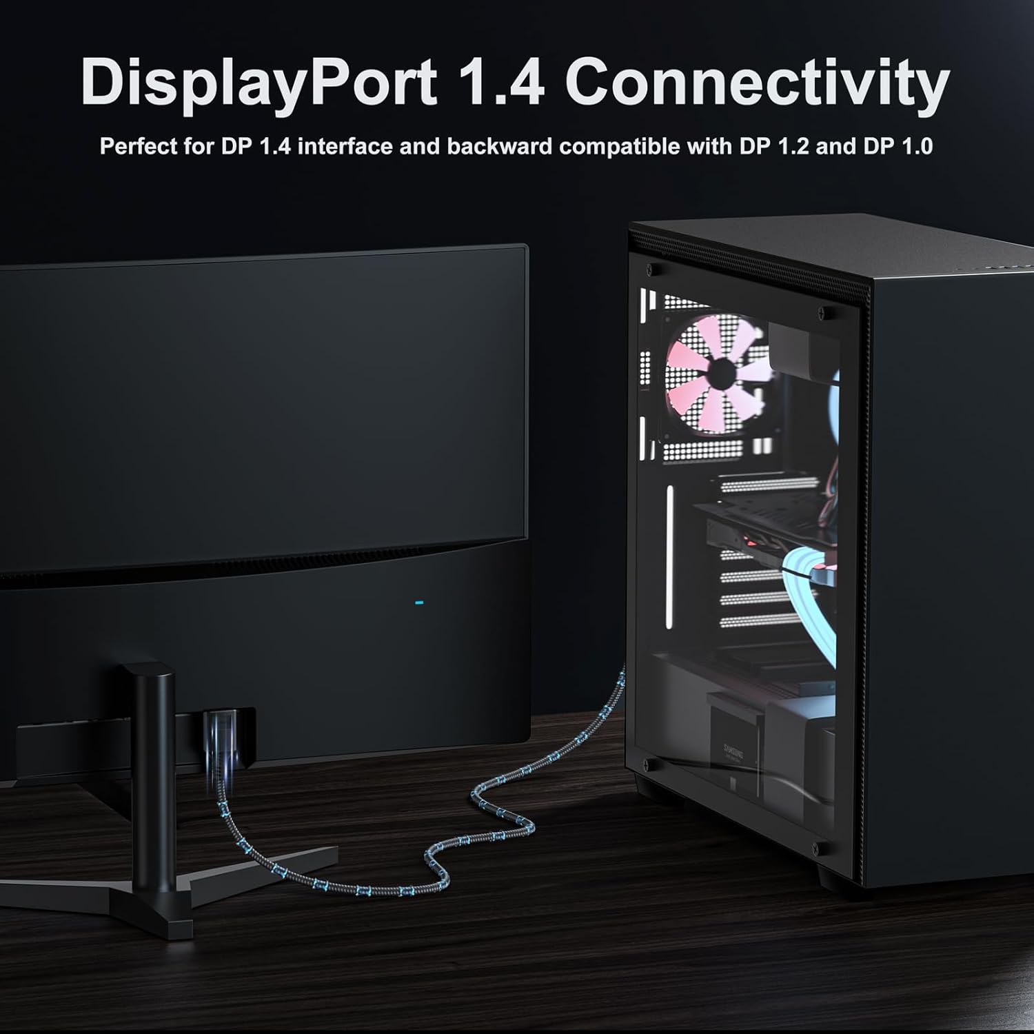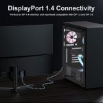 【8K@60Hz Super Resolution】 DteeDck displayport 1.4 cable supports high resolution 8K(7680×4320)@60Hz, 5K(5120×2880)@60Hz, 4K@144Hz, 2K@240Hz, 1080P@240Hz, etc. High resolution makes the picture clearer. Backward compatible with DisplayPort 1.3/1.2/1.1 and 1.0. 8K Displayport Cable 1.4 works fully with FreeSync and G-Sync. Plug and Play. Also supports flawless audio pass-through in 7.1,5.1 and 2.0 uncompressed digital audio channels.