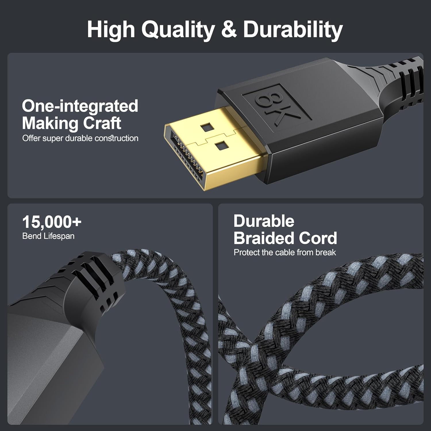 【Upgrade Durable Design】The dp to dp cable 15FT connectors is the first of its kind to feature a one-piece latch-free design to avoid damaging your device when removing the monitor and graphics card. Our Display port 1.4 cable is made of 28AWG tinned copper with triple shielding, ensuring stable signal transmission, 24K gold-plated connectors and nylon brinings for stable heat dissipation, wear resistance and extended product life.