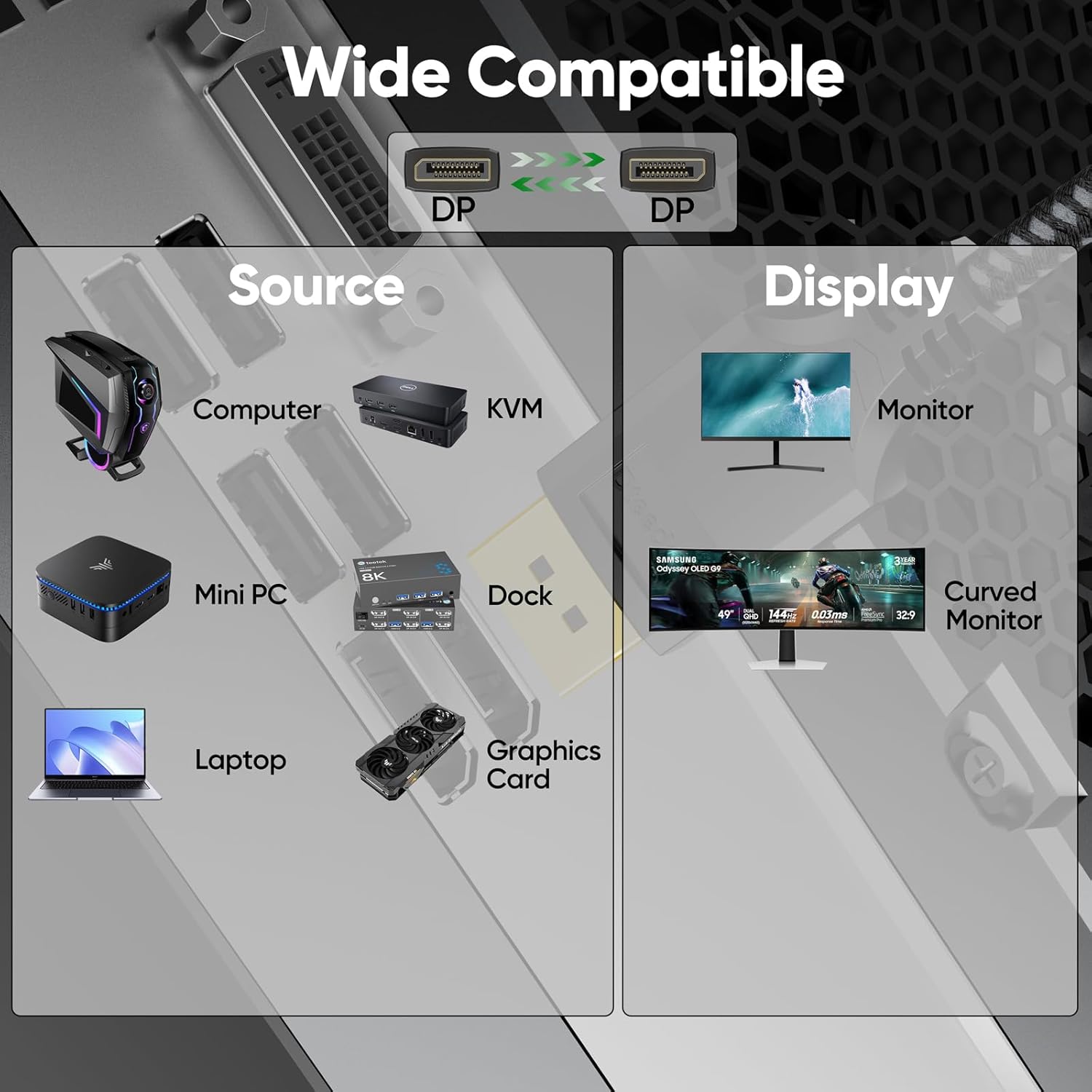 【Wide Compatibility】This display port cables directly be connected from DisplayPort-equipped desktop/laptop to monitor. Compatible with Sceptre, Odyssey G7 G9, Dell, HP, Acer, LG, iiyama, Alienware monitors and others. Supports DP, DP++, and DisplayPort++. Suitable for Graphics cards and monitors with displayport ports (Do not use extensions or adapters, signal conversion will reduce the performance)