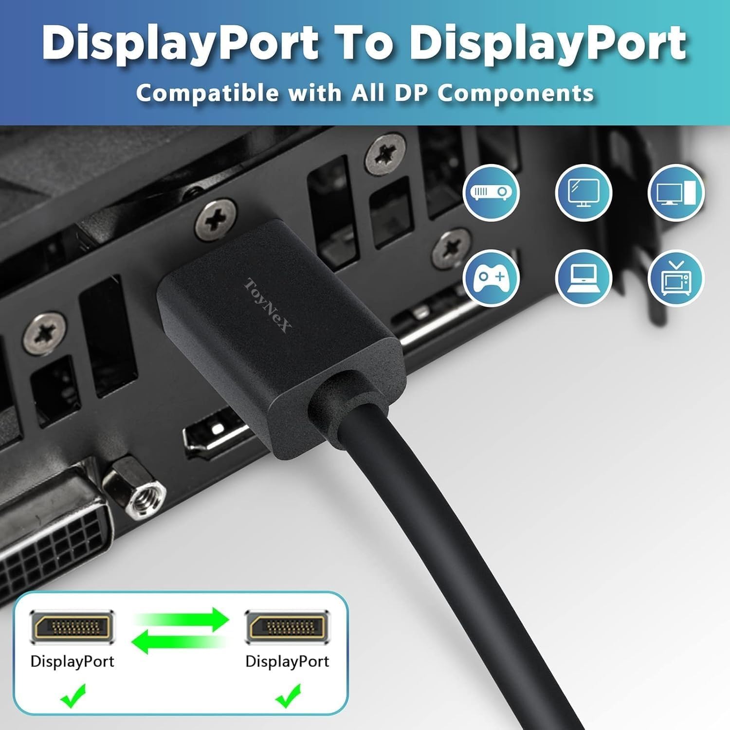 Convenient Display Port to Display Port cable directly connects a DisplayPort (DP, DP++, DisplayPort++) equipped computer to a HD monitor or projector with DisplayPort input