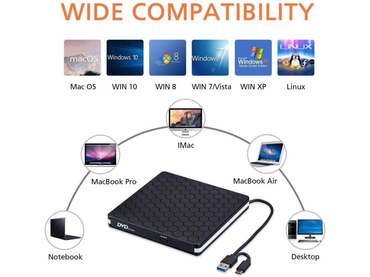 【Slim & Compact, Multi-Functional】Our cd/dvd drive usb external for pc is multi-functional that users can use to play music, watch movies, backup data, install programs, and transfer files. Please contact us at all times if you have any other questions