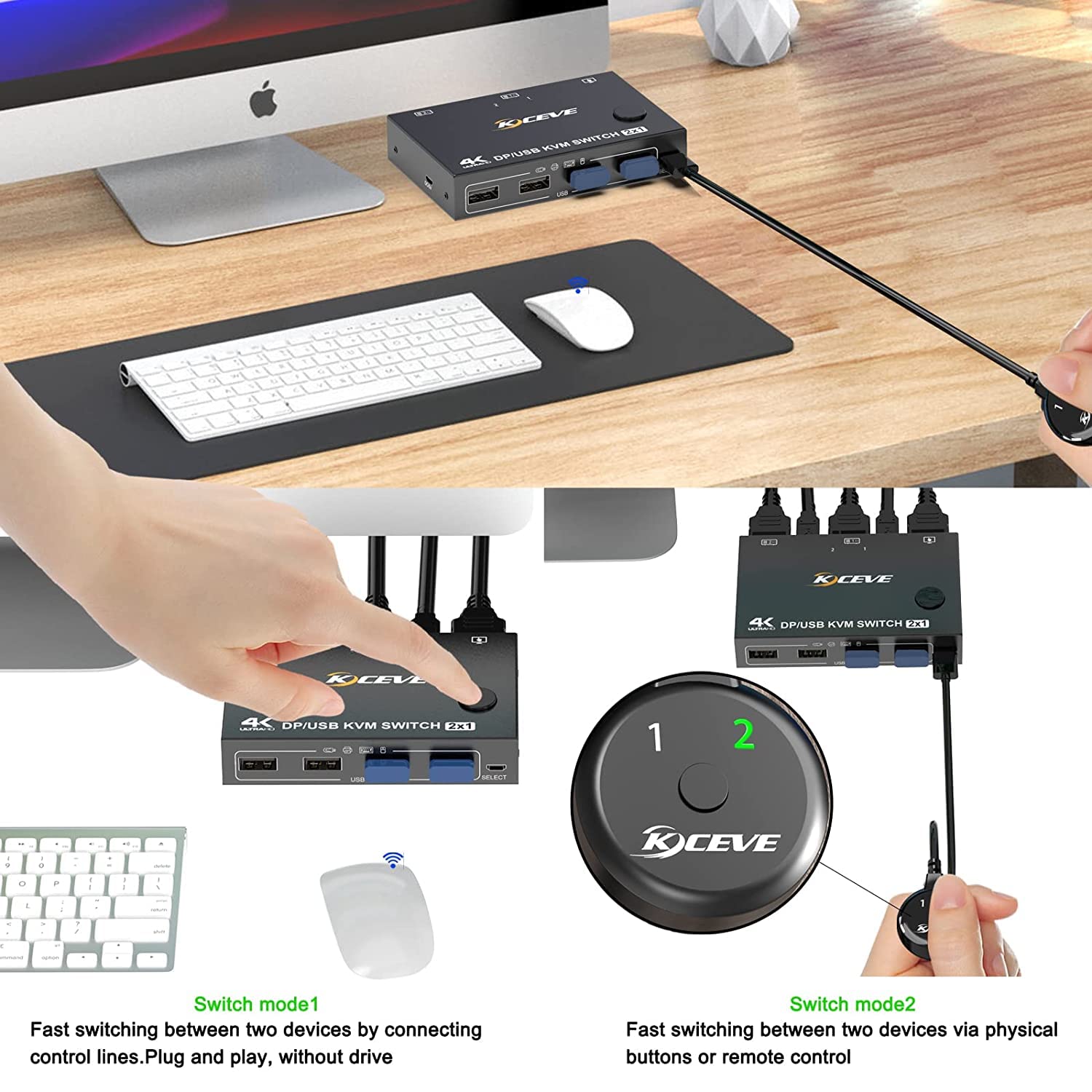 This DP KVM switch allows user to control 2 displayport computers via a single keyboard, mouse and 4k monitor. With 4 USB 2.0 ports for sharing USB devices, such as USB hub, printer, scanner, webcam etc.