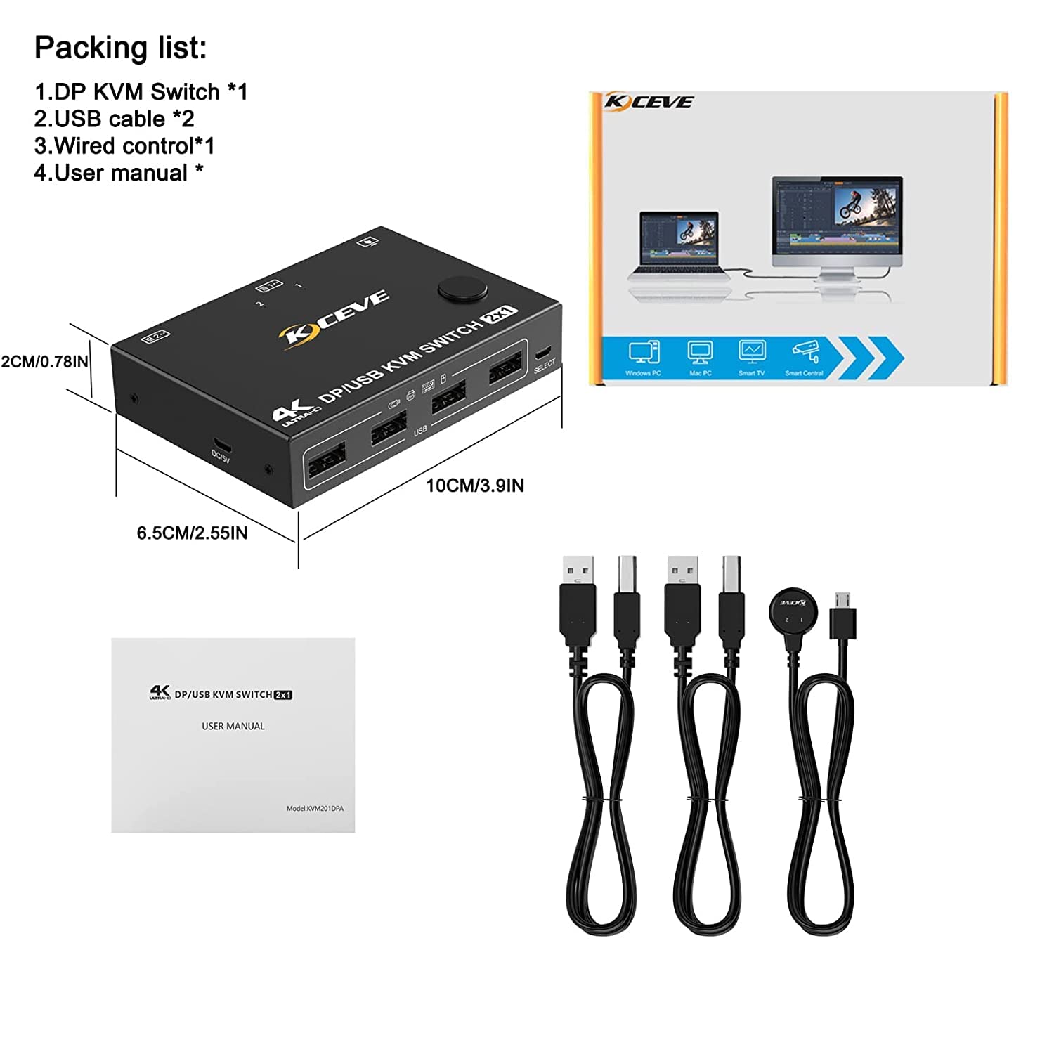 1 x DP KVM switch2 x USB cable (1.5m)1 x wired control (1.5m)1 x user manual (English)