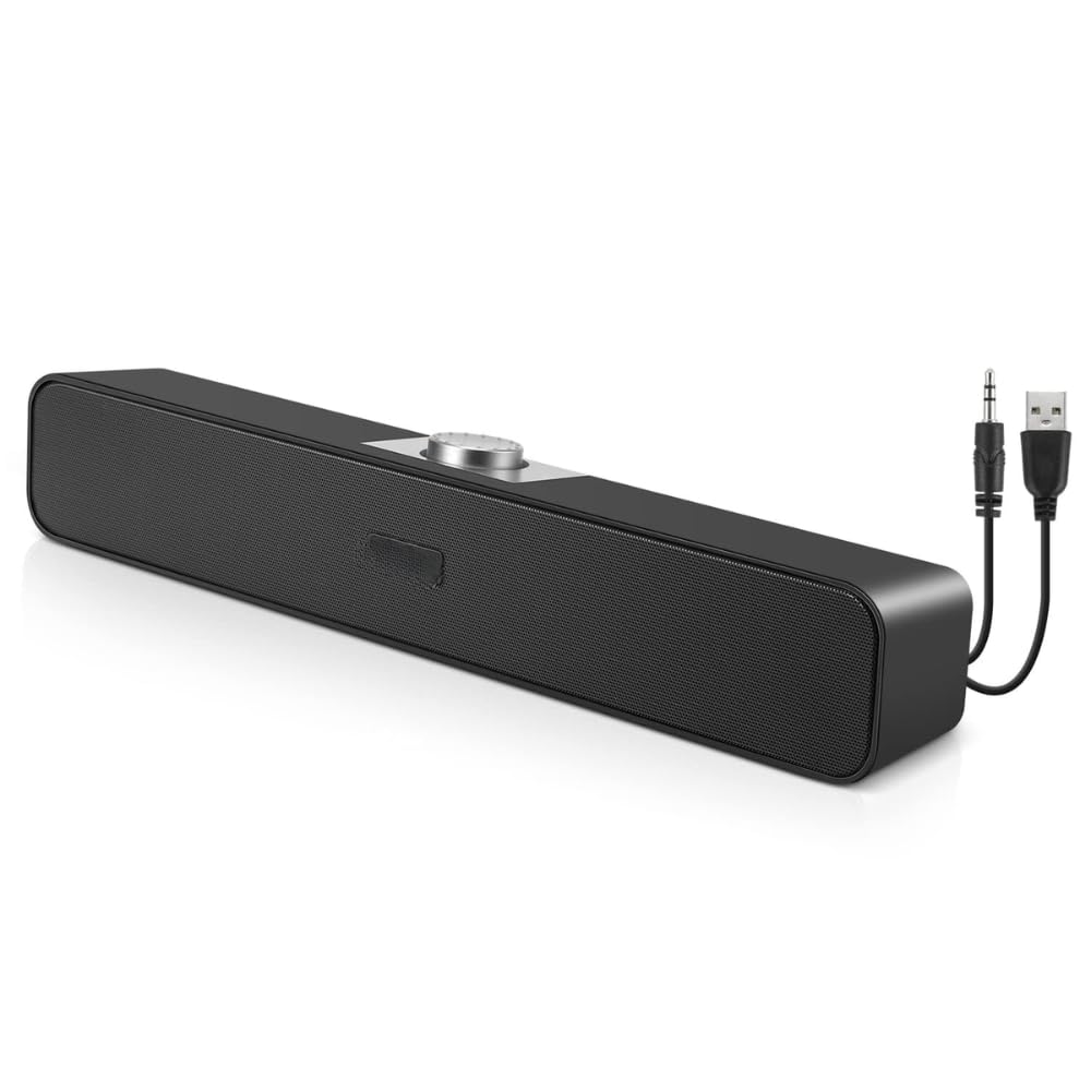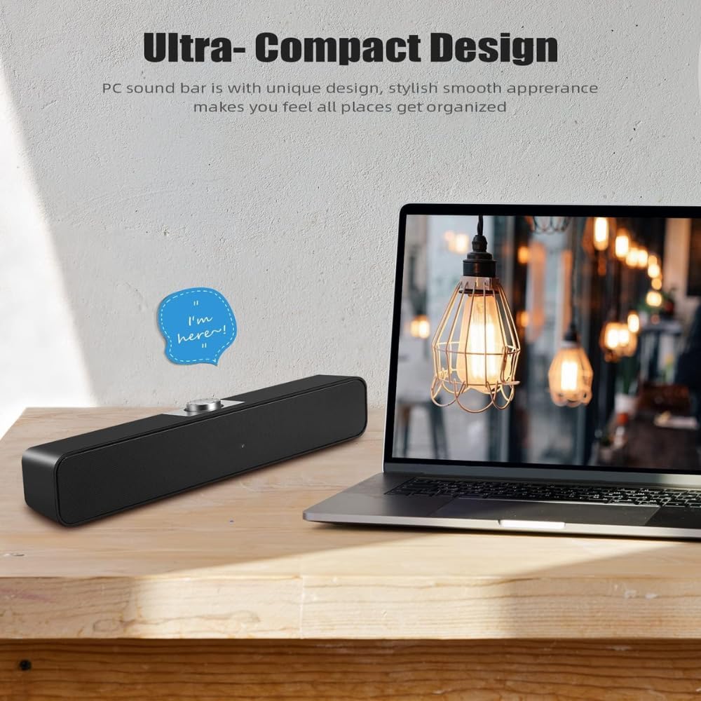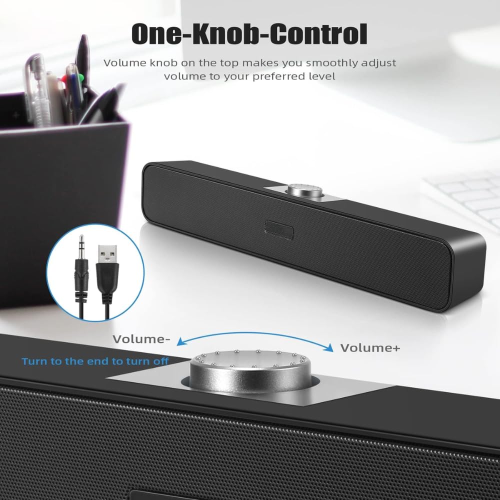 【💡 𝐒𝐥𝐢𝐦, 𝐒𝐩𝐚𝐜𝐞-𝐒𝐚𝐯𝐢𝐧𝐠 𝐃𝐞𝐬𝐤𝐭𝐨𝐩 𝐃𝐞𝐬𝐢𝐠𝐧】 Compact soundbar-style design (14.7 x 2 x 2 inches) fits easily under monitors or next to laptops. Helps reduce desk clutter while adding a sleek, modern touch. Top-mounted volume control allows quick and easy adjustments.