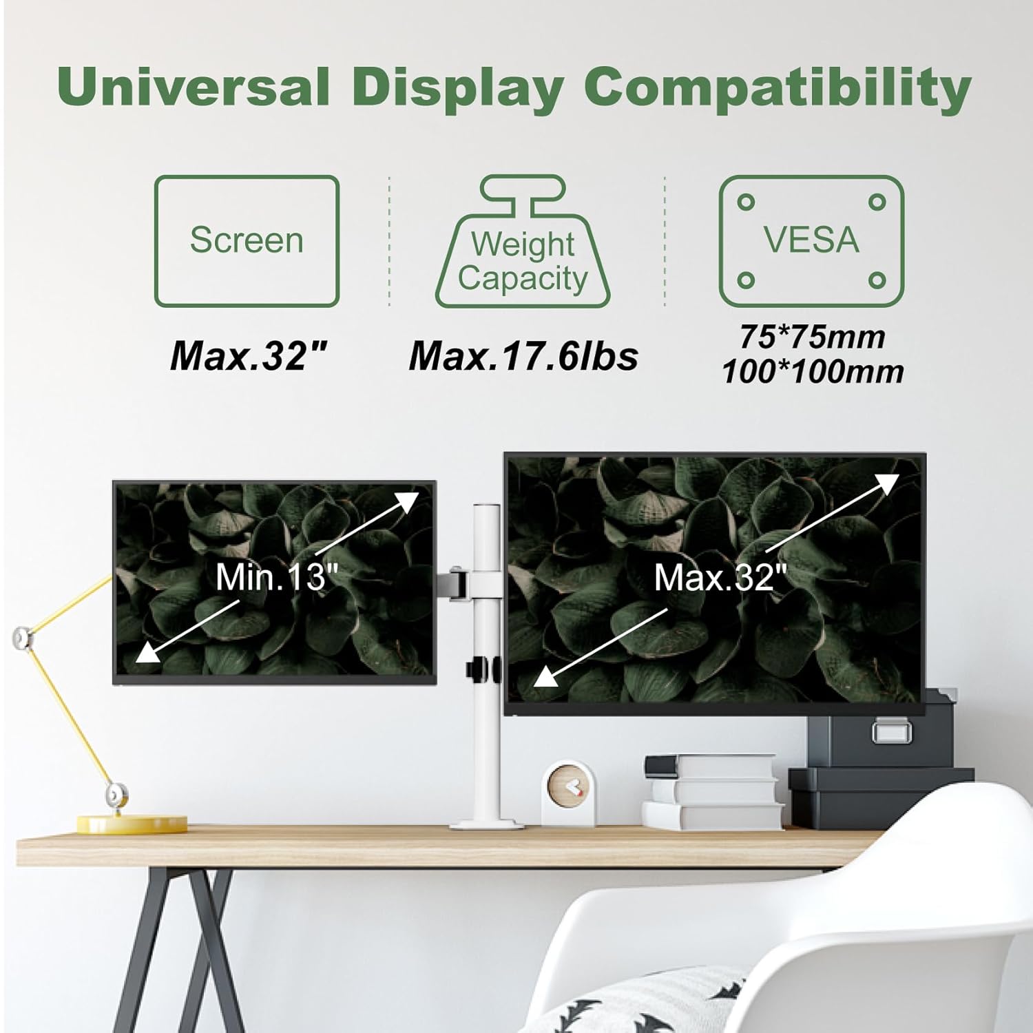 Dual 32 inch Monitor Mount: UPGRAVITY dual monitor desk mount fits most LCD LED flat/curved computer screens up to 32 inch, and supports weight up to 17.6 lbs. (per arm). Compatible with VESA mounting hole 75x75mm or 100x100mm