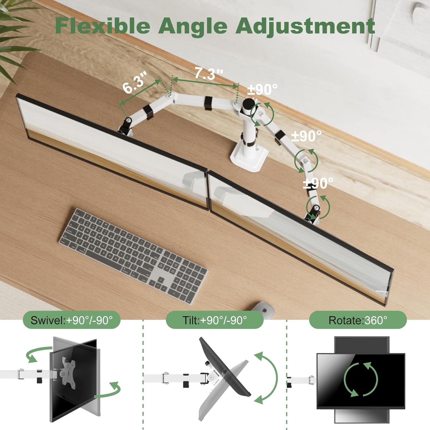 Multiple Angle Adjustments: The dual monitor arm has fluid articulation on each arm to allow for better positioning of displays to meet your custom requirements. It can rotate 360 degrees from landscape to portrait mode; tilt 90 degrees up and down; swivel 180 degrees left and right, making it easy to find the perfect viewing angle and flexible configuration options for your setup