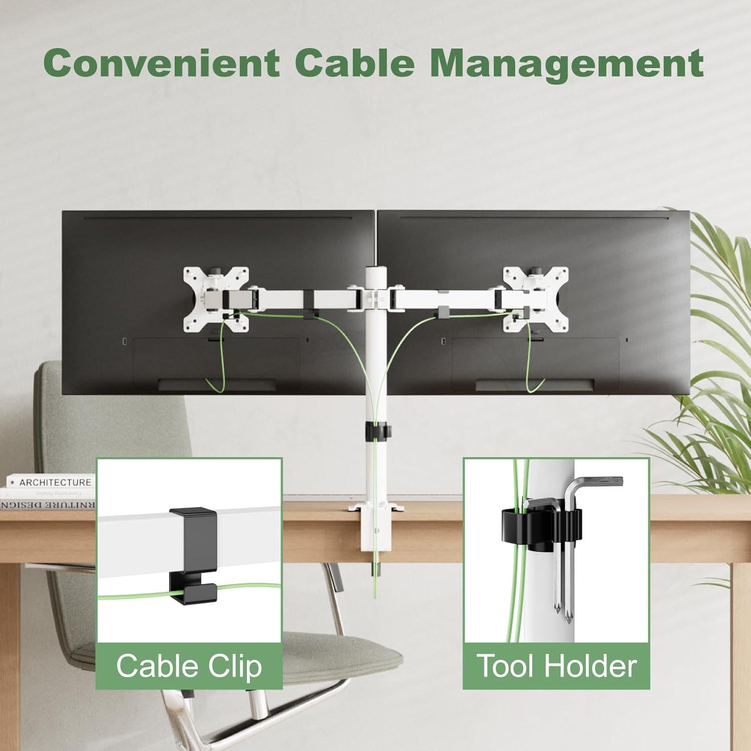Desk Space Enhancement: By lifting two monitors up, this dual screen mount expands your desk space for essential documents and accessories. Cable management clips and tool holder are included to keep your workspace organized and clutter-free. The heavy-duty steel construction ensures durability and long-lasting performance