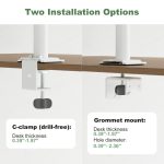 Two Mounting Options: The dual monitor stand for desk supports c-clamp installation (drill-free, compatible with desktop thickness of 0.39″-1.97″) and grommet mount (a hole diameter of up to 2.36″). Easy to assemble. Comes with clear instructions and all necessary mounting hardware