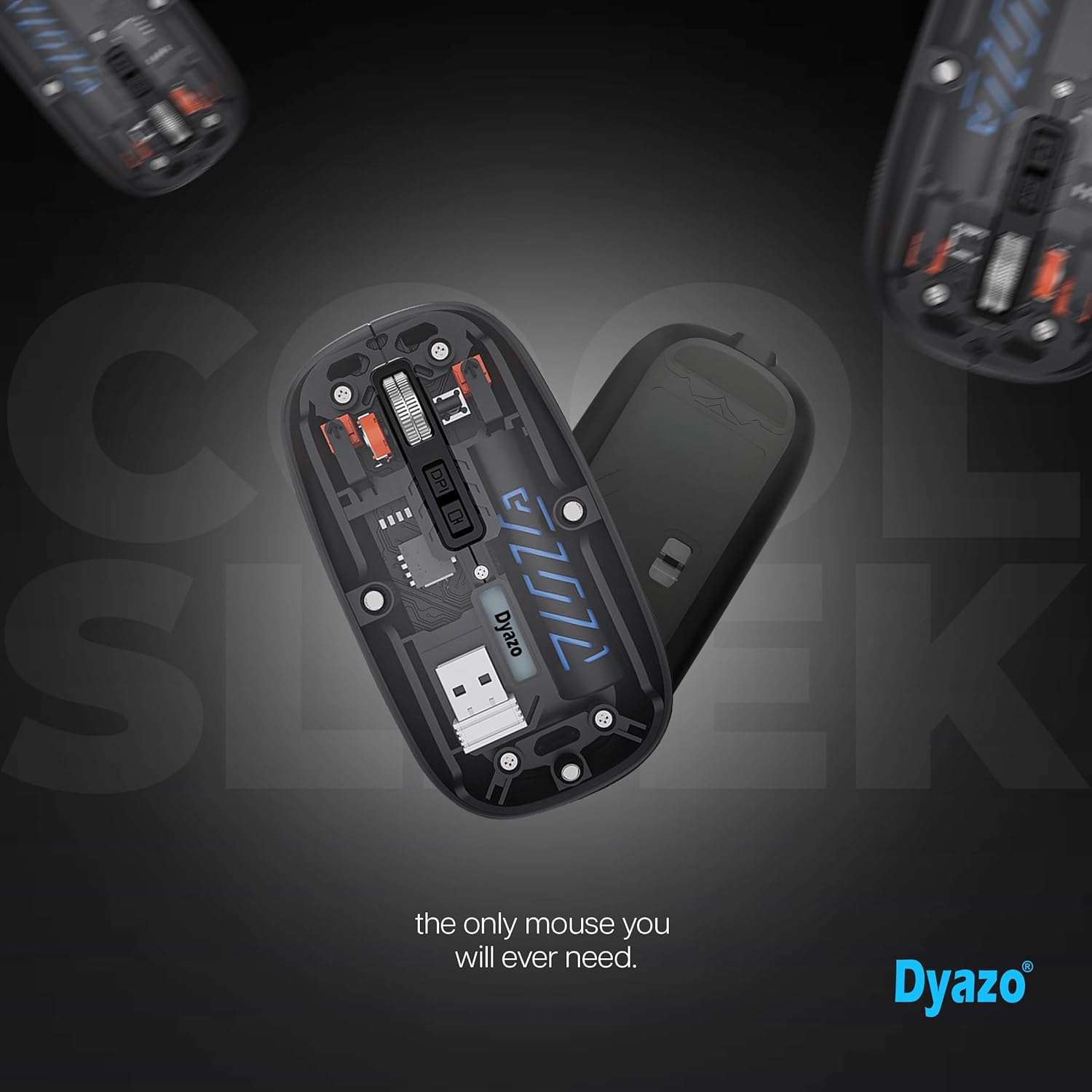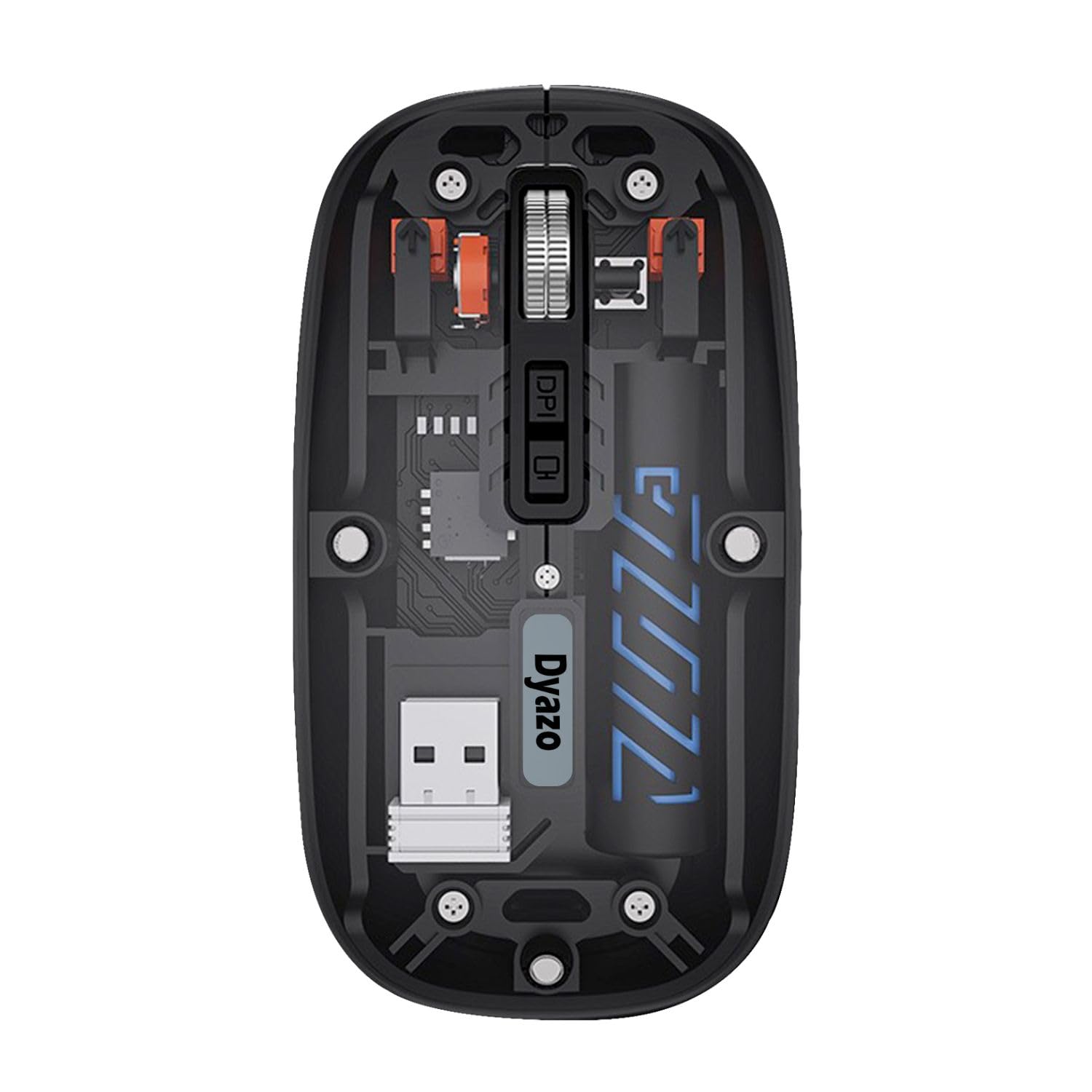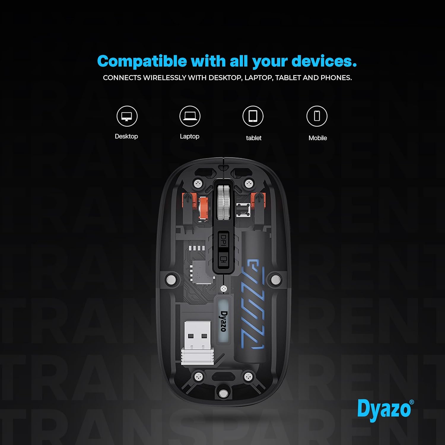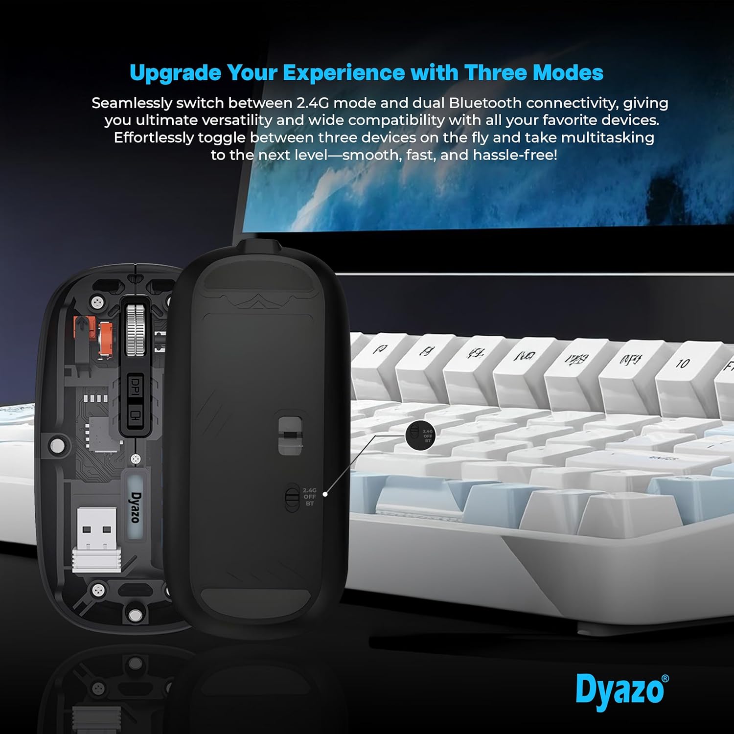 Dual Mode Connectivity: The Dyazo Transparent Wireless Rechargeable Mouse offers seamless connectivity with both 2.4GHz wireless and Bluetooth 5.2 modes, allowing easy pairing with multiple devices like Mac, laptops and PCs.