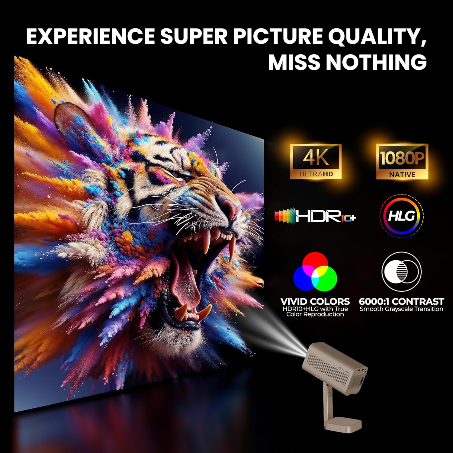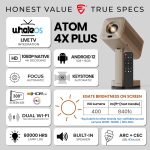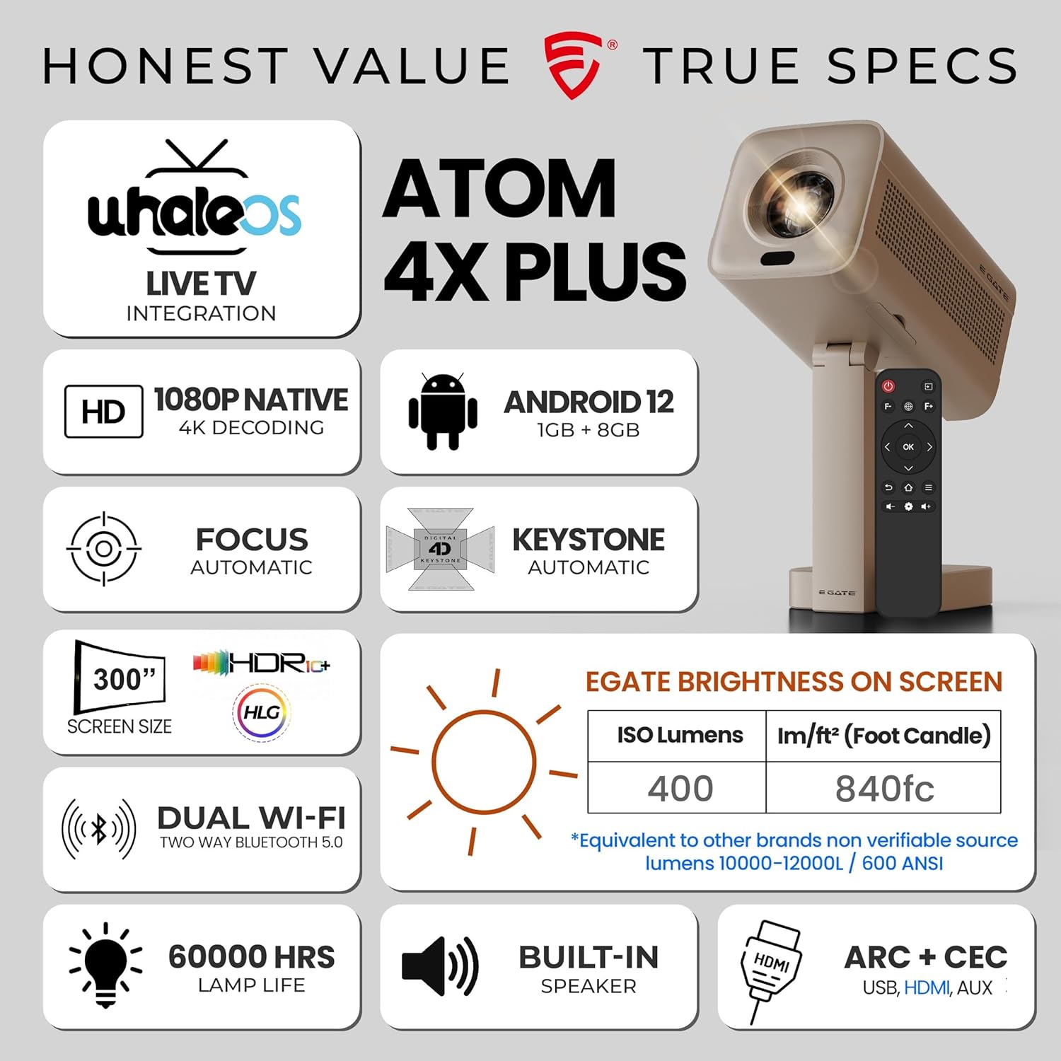 【Native 1080p | 4X Brighter | 4K HDR support | Fully Auomatic】 : Small is the new BIG, the Atom 4X Plus 2025 Upgraded model in stunning Gold is a visual Marvel with 1080p Native , HDR + HLG and 4X brighter at 400 ISO Lumens equivalent or better than chinese brands claimed but unverifiable 11,000 lumens. The 6000 : 1 Contrast delivers a visual Feast on Massive 300″ (762cm) Screen Size. LTPS Wide Screen LCD (16:9) & EGATE’s “Life Long Lamp” – 60000 Hours.