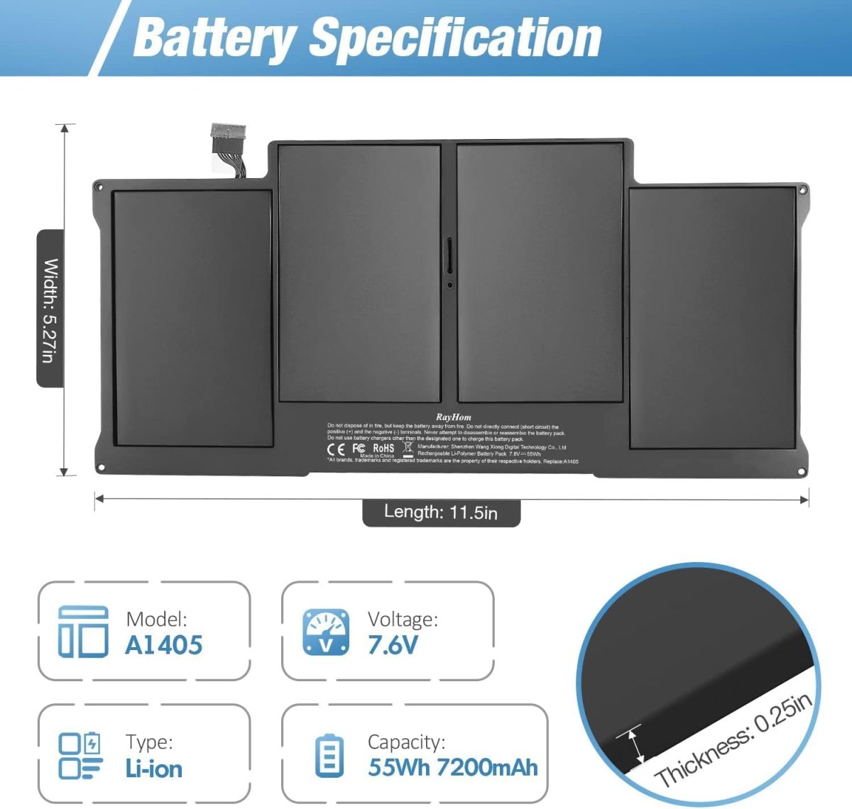 SPECIFICATION : Model Name: A1496 A1405 A1377 Notebook Battery; Battery Type: Li-polymer; Voltage : 7.6V; Capacity :54.4Wh/ about 7150mAh; Cells: 6-cell; Color: Black