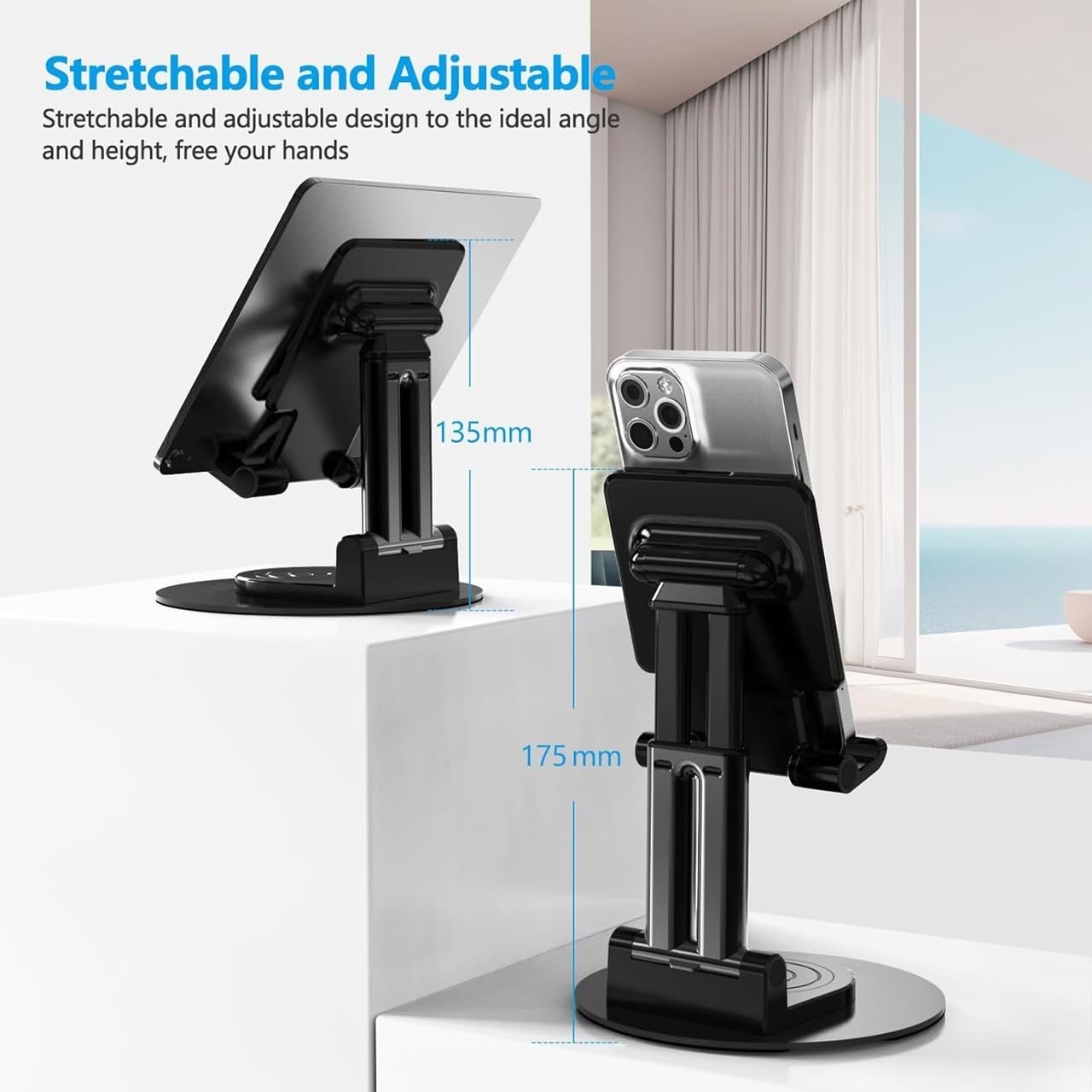 Triple Adjustment for Personalized Viewing Comfort: Featuring 180° height adjustment, 180° tilt capability and a 360° rotating base—this stand adapts to your perfect viewing angle, whether you’re typing, drawing or binge watching.