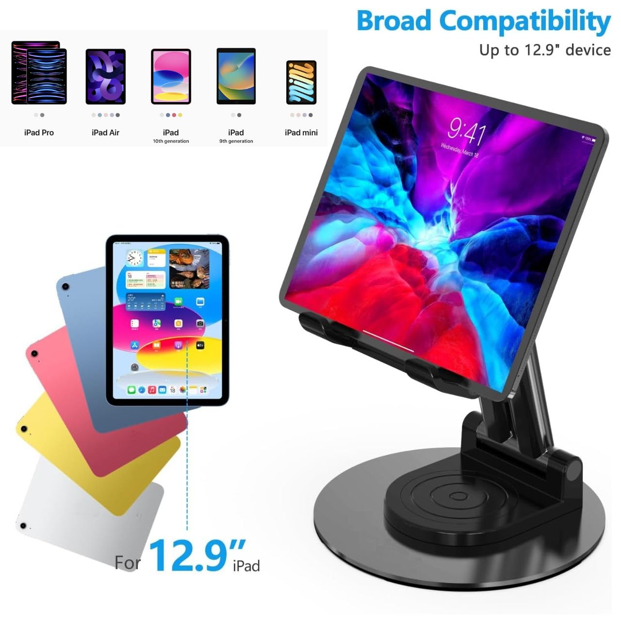 Universal Compatibility with Foldable Portability: Supports all tablets up to 12.9″, including iPad Pro, iPad Air, Samsung Galaxy Tabs and more—folds down neatly for convenient portability in bags or backpacks.