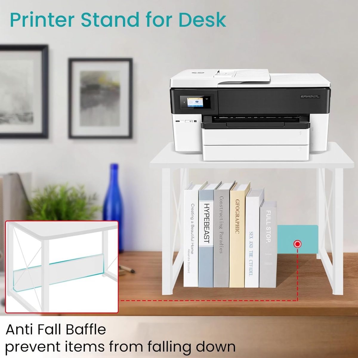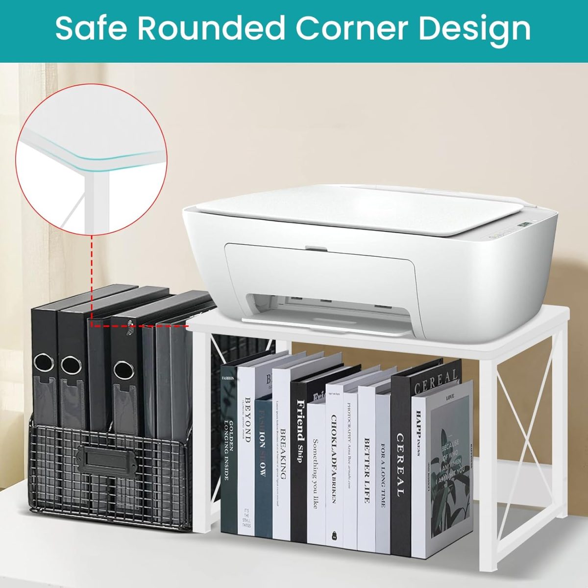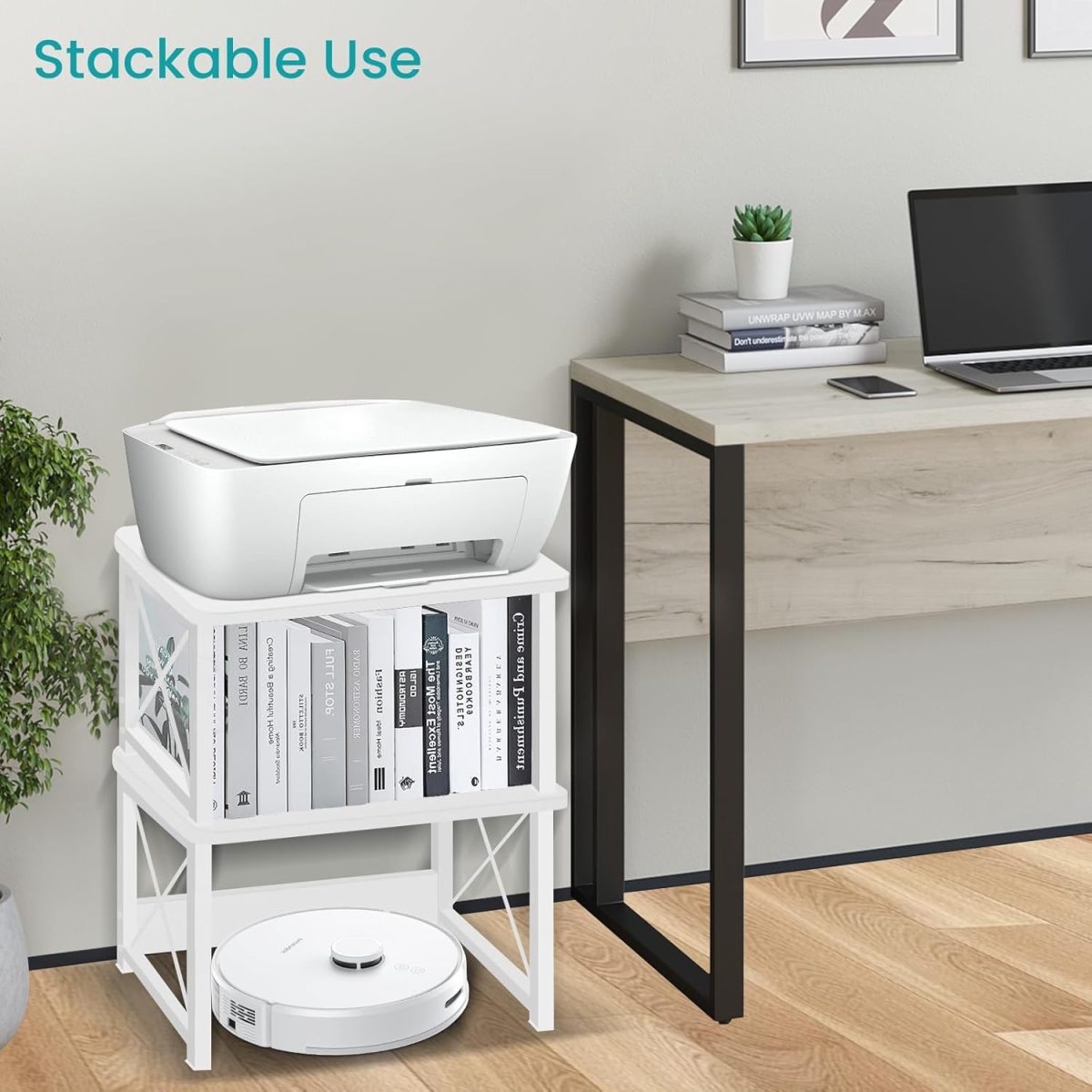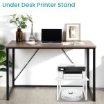 【Sturdy & Durable】This desktop printer stand is made of high-quality MDF board and thickened metal frame. It can easily hold up to 100lbs and strong enough to be stacked for use.