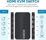 KVM Switch 4 Port – The ETZIN HDMI USB Switch allows you to manage 4 computers through 1 monitor and 3 USB devices, such as keyboard, mouse, printer, scanner, and you can easily switch between 4 computers. Make your work and life simpler and more efficient.