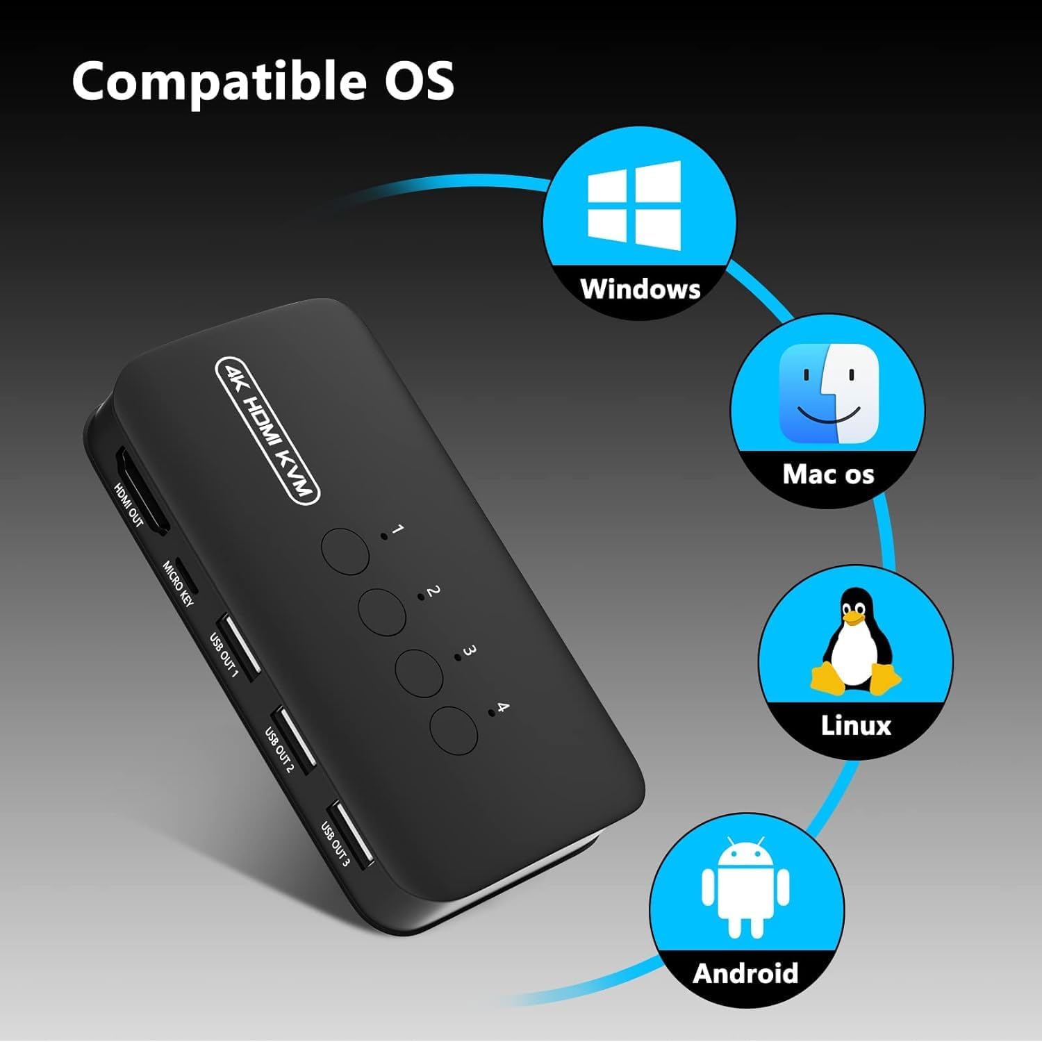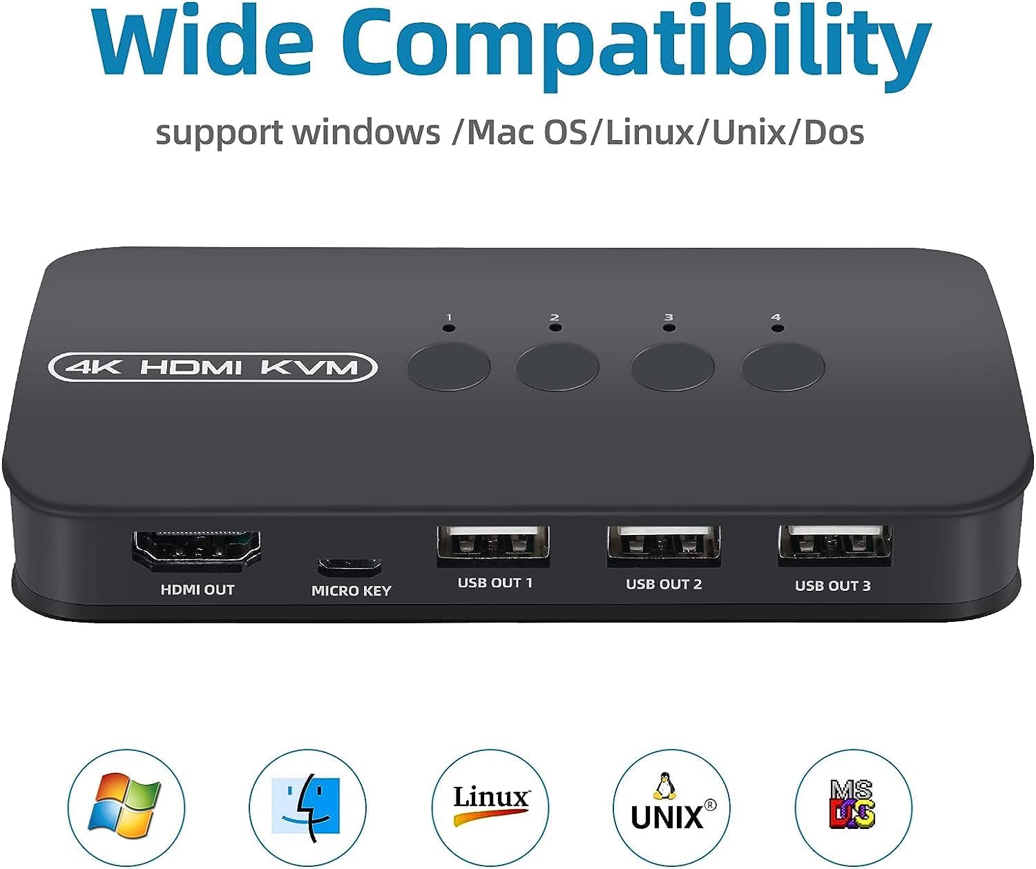 High Compatibility – This HDMI USB KVM Switcher is compatible with most devices with HDMI interfaces, such as laptop, PC, Bluray player, monitor, TV, projector, etc. And it is also driver-free for Windows 10/8/8.1/7, Mac OS, Unix and Dos.
