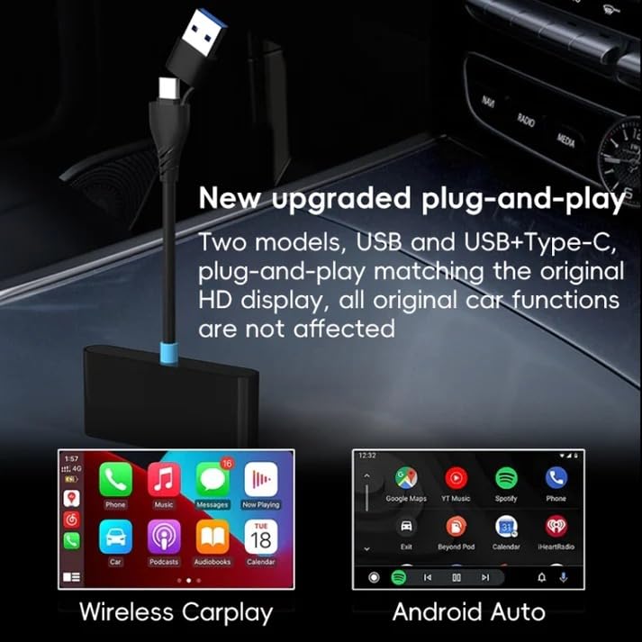 【Android/OS Seamless Compatibility】Wireless Carplay Adapter is compatible with all wired CarPlay-enabled cars and all and above models and supports USB-A and USB-C carports. Note: Please make sure your mobile phone supports AA/Carplay. and upgrade your system to Android 11.0 + and i0S 10 + or above!