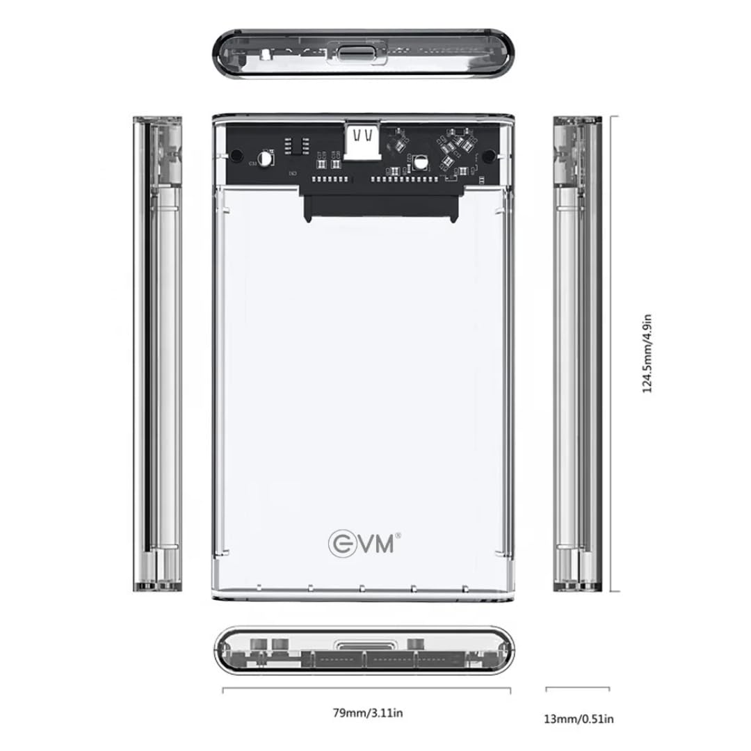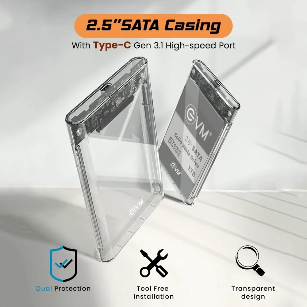 The EVM 2.5″ SATA SSD Casing Type-C Gen 3.1 is a portable external hard drive enclosure designed specifically for 2.5-inch SATA solid-state drives (SSDs). It features a transparent case cover that allows you to see the internals of your SSD, giving it a sleek and modern look.With its Type-C Gen 3.1 interface, this casing offers fast transfer speeds of over 5Gbps, ensuring quick and efficient data transfer and backup. The Type-C connection also provides convenience and versatility as it can be plugged into both Type-C and Type-A USB ports, making it compatible with a wide range of devices such as laptops, desktops, and even some mobile devices.The casing includes two cables for extra convenience. These cables include a Type-C to Type-C cable and a Type-C to Type-A cable. The Type-C to Type-C cable is perfect for connecting the casing to devices with Type-C ports, while the Type-C to Type-A cable allows you to connect the casing to devices with traditional USB Type-A ports. This ensures that you can use the casing with a variety of devices without the need for additional adapters or converters.One of the key advantages of this casing is its portability. It is small, lightweight, and easy to carry, making it ideal for on-the-go storage and data backup. Whether you’re a student, professional, or traveler, you can conveniently take your SSD and important data with you wherever you go.