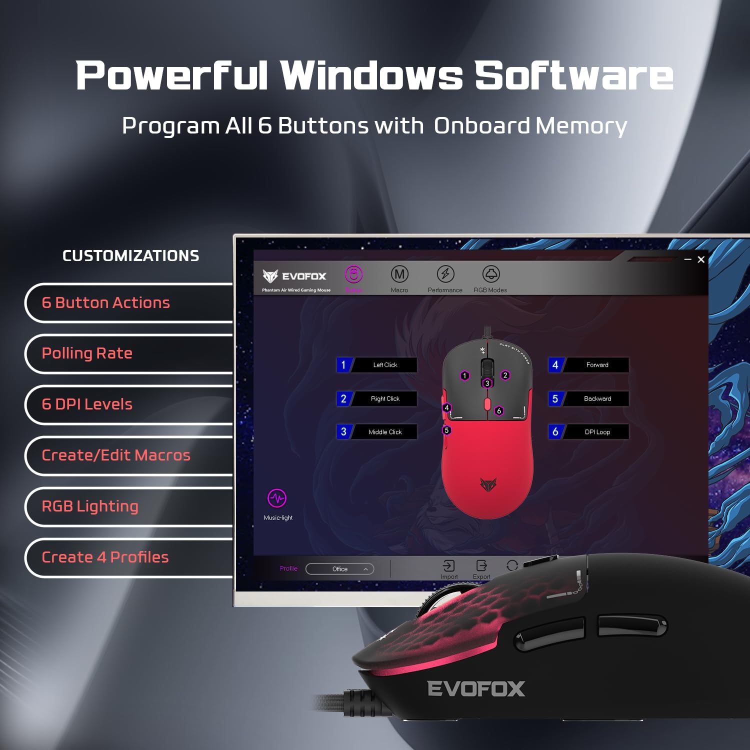The EvoFox Phantom Air Gaming Mouse software lets you customize every aspect of your gaming experience. Adjust DPI and Polling Rate, create macros, and personalize the honeycomb RGB lighting, including Music Sync mode. With an intuitive interface, map the 6 programmable buttons and fine-tune performance effortlessly.