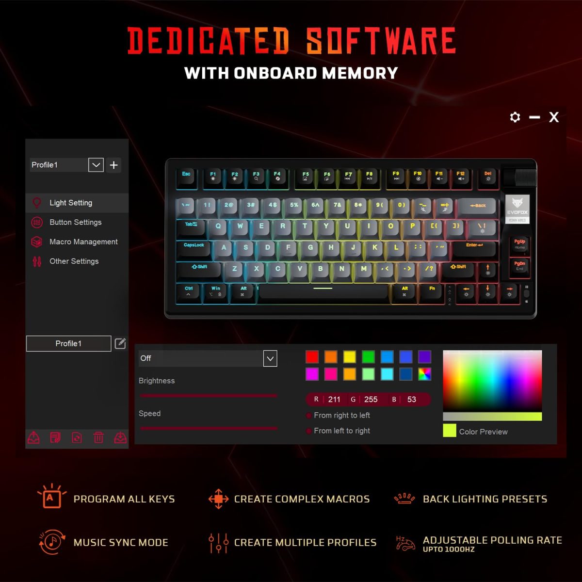 𝗚𝗮𝘀𝗸𝗲𝘁 𝗦𝘁𝗿𝘂𝗰𝘁𝘂𝗿𝗲: Advanced 9-layer gasket structure reduces noise, improves stability, and enhances tactile feedback, delivering a premium typing experience. 𝗣𝗿𝗼 𝗠𝗼𝗱 𝗛𝗼𝘁-𝘀𝘄𝗮𝗽𝗽𝗮𝗯𝗹𝗲 𝗺𝗼𝗱𝘂𝗹𝗲: Fully customizable with silent Outemu Red Dust Proof Switches for a personalized, durable, and smooth typing experience. 𝗣𝗼𝘄𝗲𝗿𝗳𝘂𝗹 𝗦𝗼𝗳𝘁𝘄𝗮𝗿𝗲: Advanced Windows software with on-board memory for complete customization, enabling users to program keys, create macros, control backlighting effects, and manage profiles for ultimate control. 𝗣𝗿𝗶𝘀𝗺 𝗥𝗚𝗕 𝗕𝗮𝗰𝗸𝗹𝗶𝗴𝗵𝘁𝗶𝗻𝗴 : Per key RGB backlighting with 21 effects and “Audio Sync Mode” for a personalized and immersive setup. 𝗖𝗿𝗼𝘀𝘀-𝗣𝗹𝗮𝘁𝗳𝗼𝗿𝗺 𝗖𝗼𝗺𝗽𝗮𝘁𝗶𝗯𝗶𝗹𝗶𝘁𝘆: Easily switch between Windows and Mac modes, enhancing versatility for different operating systems. 𝗗𝗲𝘁𝗮𝗰𝗵𝗮𝗯𝗹𝗲 𝗕𝗿𝗮𝗶𝗱𝗲𝗱 𝗖𝗮𝗯𝗹𝗲: Robust and interference-free 1.5m Type-C cable with EMI ring for easy portability.