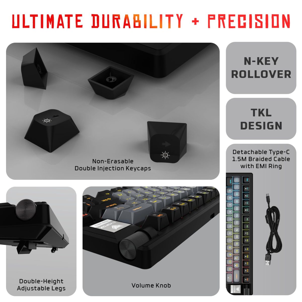 Elevate your gaming with the EvoFox Ronin TKL Wired Mechanical Keyboard—featuring ultra-silent Outemu Red switches, a premium gasket design, vibrant per-key RGB lighting, hot-swappable sockets, and onboard memory for a fully customized, pro-level experience.