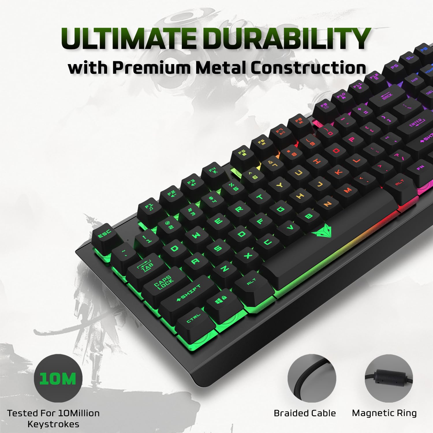 Experience a rugged gaming keyboard that delivers a deeply satisfying tactile keystroke experience, immersing you further into the game and elevating your overall gaming performance. Extra durability is ensured with a braided cable and magnetic ring for added longevity