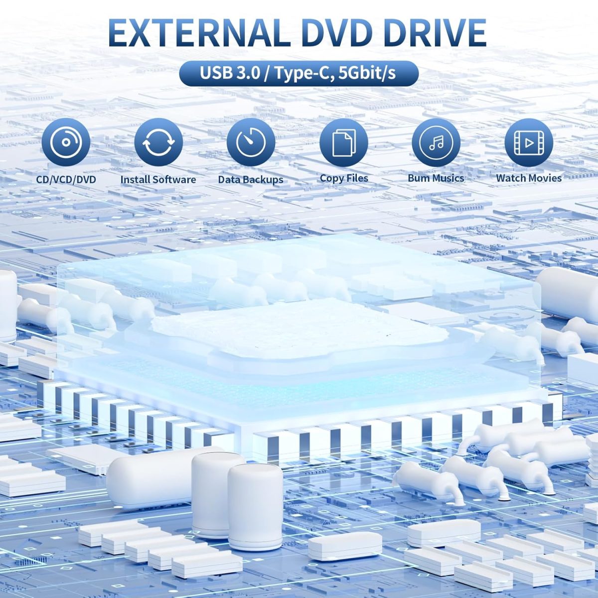 【Dual-Interface Turbo Speed】 Experience accelerated performance with the CD Rom external drive for the laptop featuring dual USB 3.0 + Type-C connectivity. Achieve rapid data transfers (backward compatible with USB 2.0) for seamless movie streaming, efficient software installations, and reliable disc burning operations. Smart heat dissipation maintains optimal speeds during extended use