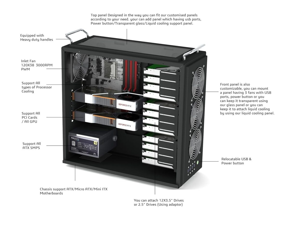 Equipped with heavy duty carry handle for easy installation and upgrades. XtremeMiner model LR is committed to provide maximum compatibility with various modules available, can be used as NAS server, Gaming setup, Professional computer, capable to maintain lower temperature on maximum CPU/GPU utilization. Can be configure in all the way whatever you want. Front and Top panel are available in various format like Panel with fans, transparent panel, Panel with USB, Panel with multiple Header Outputs.