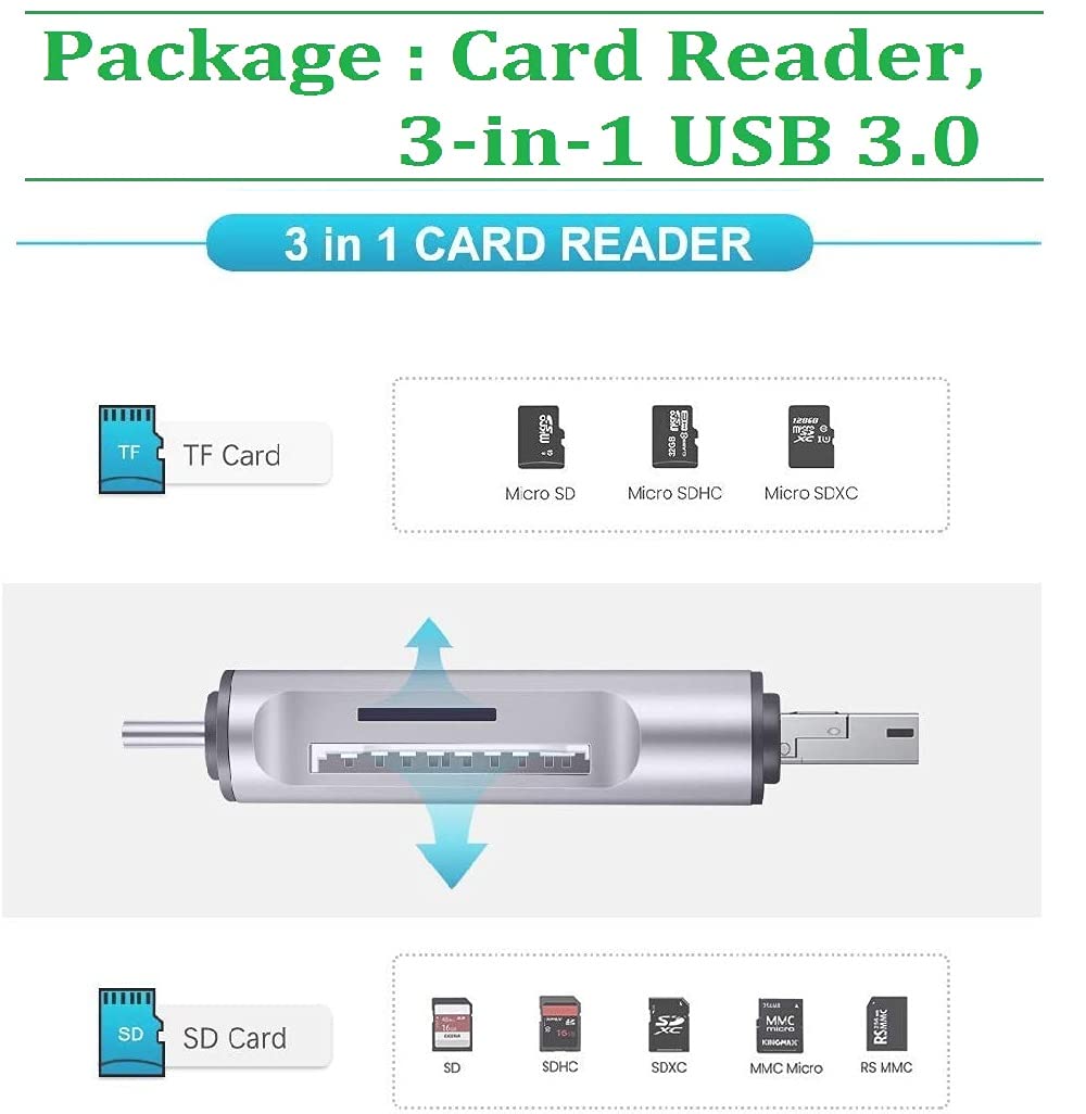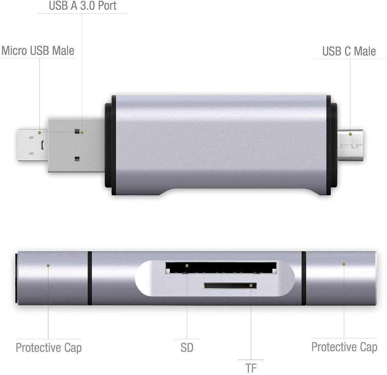 ALL IN ONE CARD READER — Support to Read/write SDXC, SDHC, SD, MMC, RS-MMC, Micro SDXC, Micro SD, Micro SDHC Card and UHS-I Cards USB 3.0 CARD READER — Enables to Transfer Data at Rates of up to 5Gbps for shorter sync time. Backwards compatible with USB 2.0 and USB 1.1, No need driver and app installation.This SD / Micro SD card reader do not support read two cards simultaneously. MICRO OTG / USB C OTG ADAPTER — Transfer Files, Pictures, Videos from TF/SD card to your PC, Android cell phone, Android tablet, and USB C laptops, cell phones, tablets conveniently. Adding an extra memory card to your OTG cellphones to storage more movies, pictures, music and enjoy them freely Support Windows, Linux, Mac OS and Android (win98/ME/2000/XP/7/8/MAC OS/Android ) and other systems. WIDE COMPATIBILITY — Standard USB plug (type A), Micro USB plug (type B) and USB C plug (Type C) combination, making this card reader compatible with all tablets and Android/ USB C smartphones that support OTG function