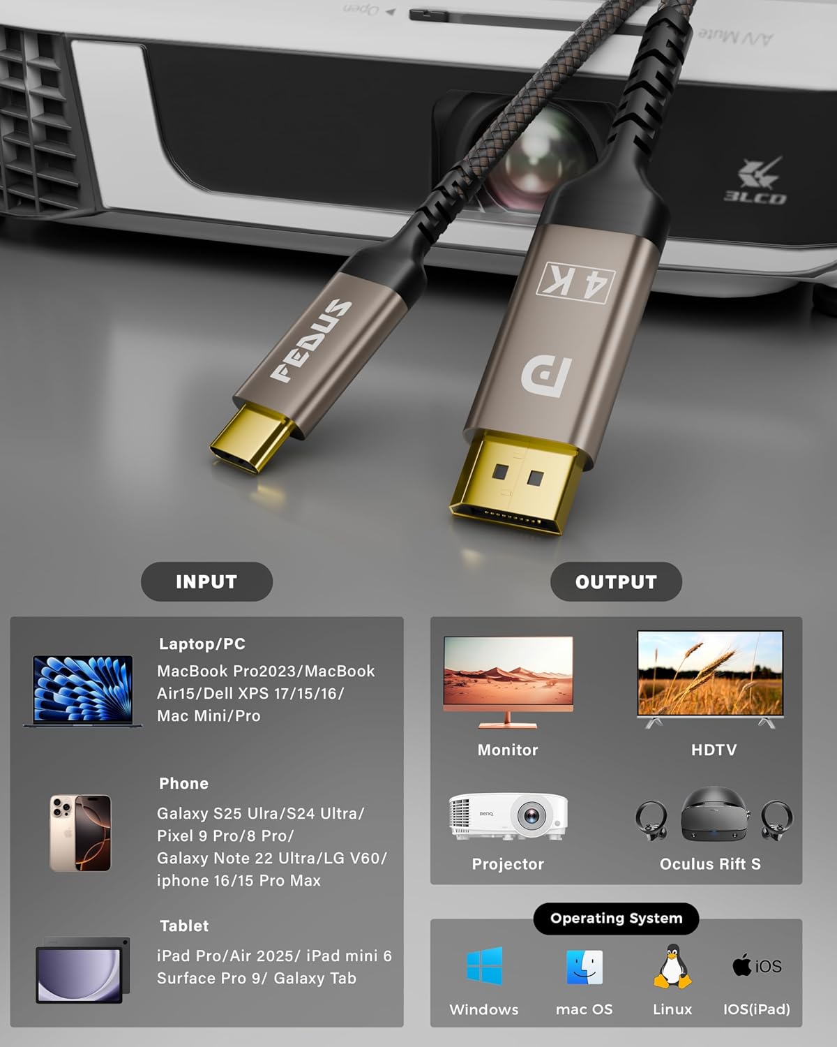 ▶NOTE BEFORE PURCHASE: (1) This cable is unidirectional. It only transmits a signal from a USB-C (source) device, such as a laptop or mobile phone, to a DisplayPort (DP) monitor. It is not compatible with devices whose USB-C interface does not support the protocol of DP Alt Mode. (2) This USB-C to DP1.4 cable does not support charging and only supports the transmission of audio and video signals. ▶ENJOY CRISP 4K RESOLUTION: Supports up to 4K@60Hz (2K@144Hz, 2K@165Hz, 2K@170Hz, 1080p, 720p) resolution, providing you with a smooth and stable visual experience. Connect your cell phone, laptop, or tablet directly to your monitor, HDTV, or projector with this USB-C to DisplayPort cable, ideal for gaming, meetings, and work. Enjoy a smooth experience without tearing, lag, or black screens. Note: Ensure both your input and output devices support 4K before connecting. ▶PLUG & PLAY- Ready to use straight out of the box, our USB-C to DisplayPort cable requires no additional software or drivers, ensuring a simple plug-and-play experience. Stream 4K UHD content from your USB-C laptop (such as MacBook Pro/Air, Surface), tablet, or phone to a monitor, TV, or projector with DisplayPort input. Supports up to 4K@60Hz, including (2K@144Hz, 2K@165Hz, 2K@170Hz, 1080p, 720p) for high definition monitors or projectors. ▶MULTI-MODE VIEWING EXPERIENCE: The Thunderbolt to DP 1.4 cable supports Multi-Stream (MST) for daisy-chaining multiple monitors, which means you can achieve the flexibility of having several displays for work or entertainment. It also supports Display Stream Compression (DSC) for high-resolution and frame rate video through existing physical interfaces. It supports mirror & extend mode, and also supports MacBook Clamshell mode with just a power on. Note: Please distinguish the USBC and DP interface ▶STABLE & LAG-FREE SIGNAL: With FreeSync & G-Sync support, this USB-C to DisplayPort cable ensures smooth, lag-free gaming and video playback. Equipped with DP 1.2, it delivers high-bandwidth data transfer of 21.6 Gbps without delay. HDCP 1.3 compatibility ensures secure content protection, and plug-and-play functionality means no software or drivers are required—just connect and enjoy lag-free performance.📌𝗡𝗼𝘁𝗲: 𝗡𝗢𝗧 𝗦𝘂𝗽𝗽𝗼𝗿𝘁 𝗛𝗨𝗕 𝗼𝗿 𝗗𝗼𝗰𝗸, 𝗡𝗼𝘁 𝗰𝗼𝗺𝗽𝗮𝘁𝗶𝗯𝗹𝗲 𝘄𝗶𝘁𝗵 𝗨𝗹𝘁𝗿𝗮-𝗪𝗶𝗱𝗲 𝗠𝗼𝗻𝗶𝘁𝗼𝗿𝘀 ▶SUPERIOR STABILITY: The advanced built-in IC chip converts USB-C digital signals to DisplayPort, and the nickel-plated connector ensures secure, high-speed transmission without interference. The unibody molding prevents breakage, while the aluminum case enhances heat dissipation for longer use. Thicker copper wire further reduces signal loss and maintains optimal conductivity. ▶UPGRADED MATERIAL: Braided nylon cable provides added durability and strain relief, making plugging and unplugging easier. Premium aluminum alloy case ensures greater heat dissipation, and high-quality connectors provide secure, high-speed data transmission. The solid build makes this cable unbreakable, while thicker copper wire maximizes conductivity and minimizes signal loss. Triple-shielded core construction reduces interference, minimizing signal loss and ensuring high-quality video. ▶UNIVERSAL COMPATIBILITY: Only for USB-C ports with video output function “DP Alt Mode” and Thunderbolt 3 & 4, the USB C to Displayport 1.4 cable is compatible with iPhone 16/15 Pro Max/Pro/Plus, Galaxy S25/S24 Ultra, Mac Mini M4/M4 Pro, MacBook Pro/Air 2025/2024, iPad Pro/Air 2025/2024, XPS 17,15,13, Dell, HP Chromebook, Surface Book, Samsung Tablet S9, Note 20, LG V40, Valve Steam Deck and more. Connect to all devices with DP ports, compatible with Nvidia RTX 4090 and AMD Radeon RX 7900 graphic cards, Odyssey G8 G9, HDTV, and more ▶OUTSTANDING WARRANTY AND SERVICE: Our type c thunderbolt to hdmi cable must bring you a great user experience, and we believe in our quality. 12-month warranty and 24 hours of online customer service. If you have any questions, please get in touch with us out of your mind directly welcome.