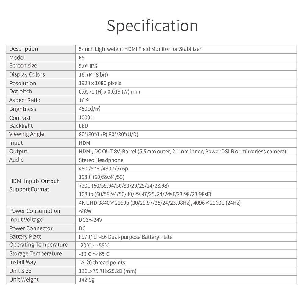 Get this F5 5 inch DSLR on Camera Field Monitor Small Full HD 1920×1080 IPS Video Peaking Focus Assist with 4K HDMI 8.4V DC Input Output Include Tilt Arm.