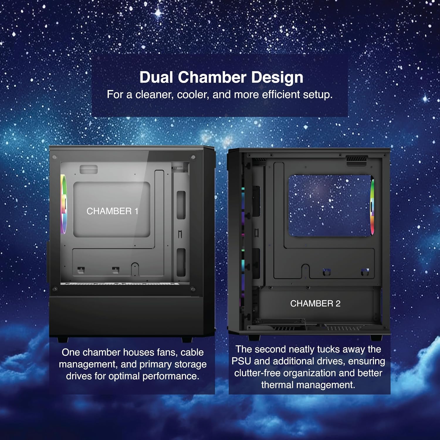 📁 Smart Dual-Chamber Layout: One chamber for cables and storage, the other for PSU—ensuring clean layout, better airflow, and easy upgrades.