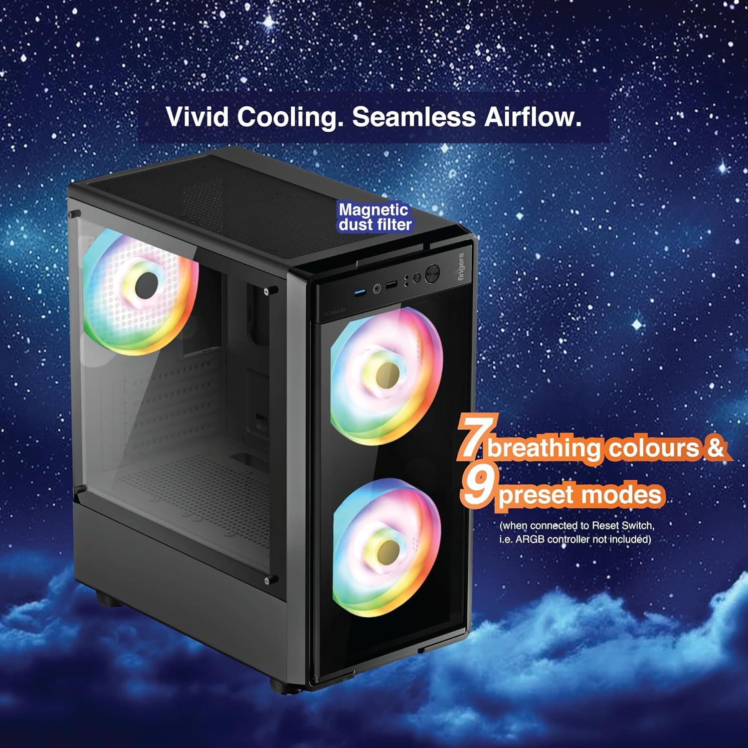 🌀 Pre-installed ARGB Fans: Equipped with 3 sets of 12 cm ARGB Fans, experience vibrant cooling with 7 breathing colours & 9 preset modes (via Reset Switch, ARGB controller not included). Keeps your setup cool & visually dynamic.