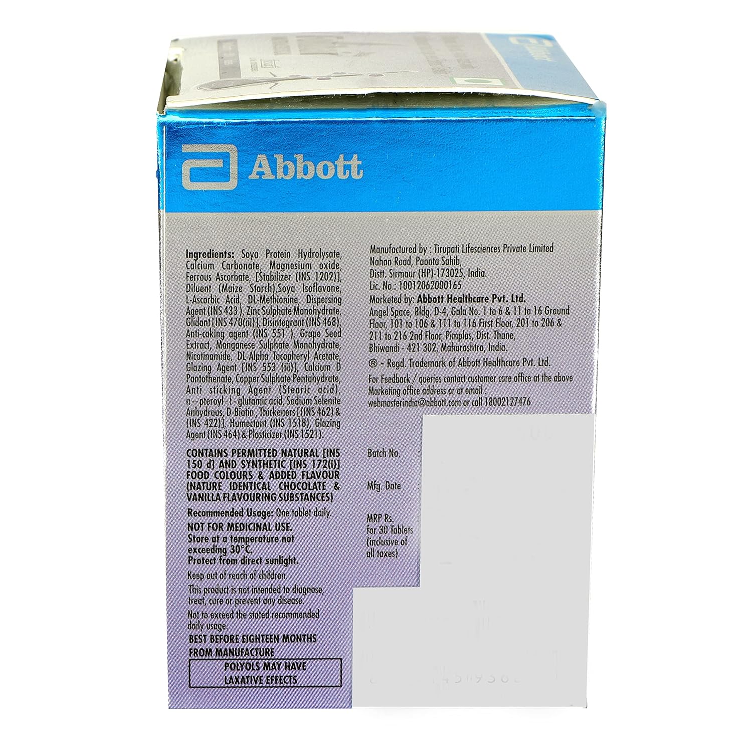 Packer : Tirupati Lifesciences,Nahan Road,Paonta Sahib, Dist- Sirmour, HP, 173025, India Marketed by – Abbott Healhcare Pvt.Ltd. Email-webmasterindia@abbott.com
