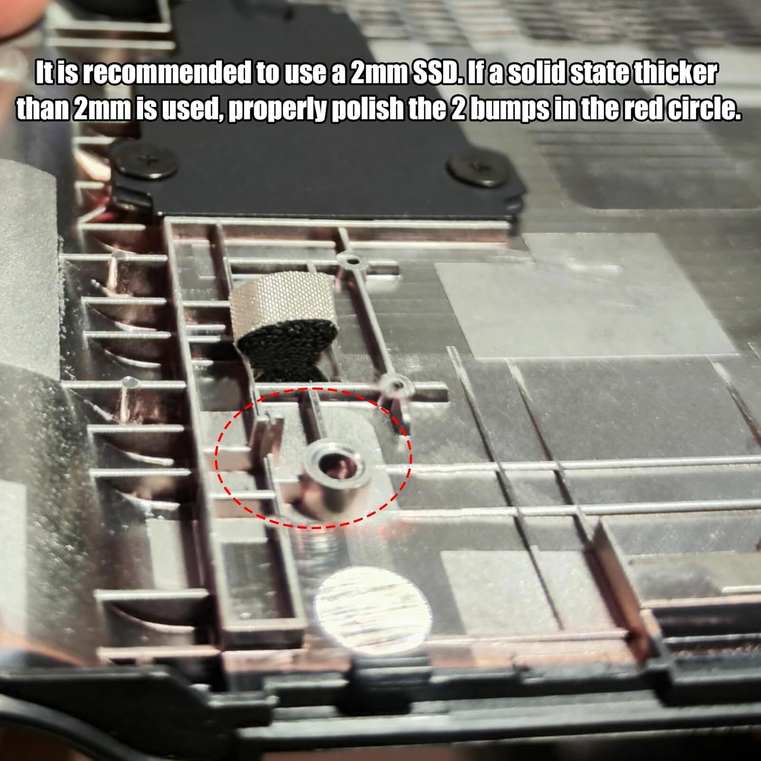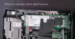 It should be noted that the use of this expansion board requires certain technical and operational skills, it is recommended to install and use under the guidance of professionals. (Please note: It is recommended to use 2mm SSD hard disk, if you use more than 2mm thickness of SSD hard disk, please properly sanding flat the back cover within the red circle of the 2 raised position. Please see the connection schematic).