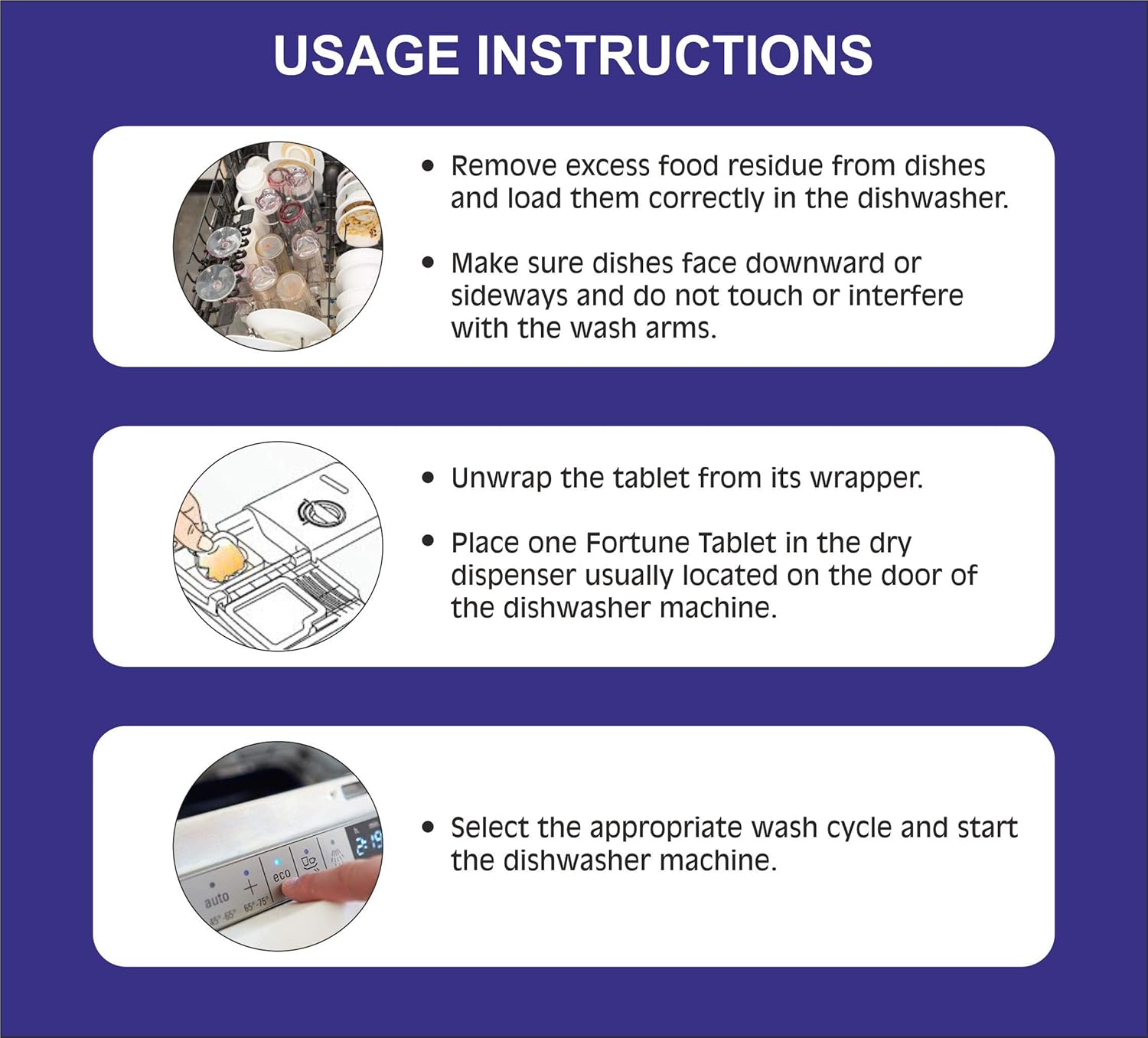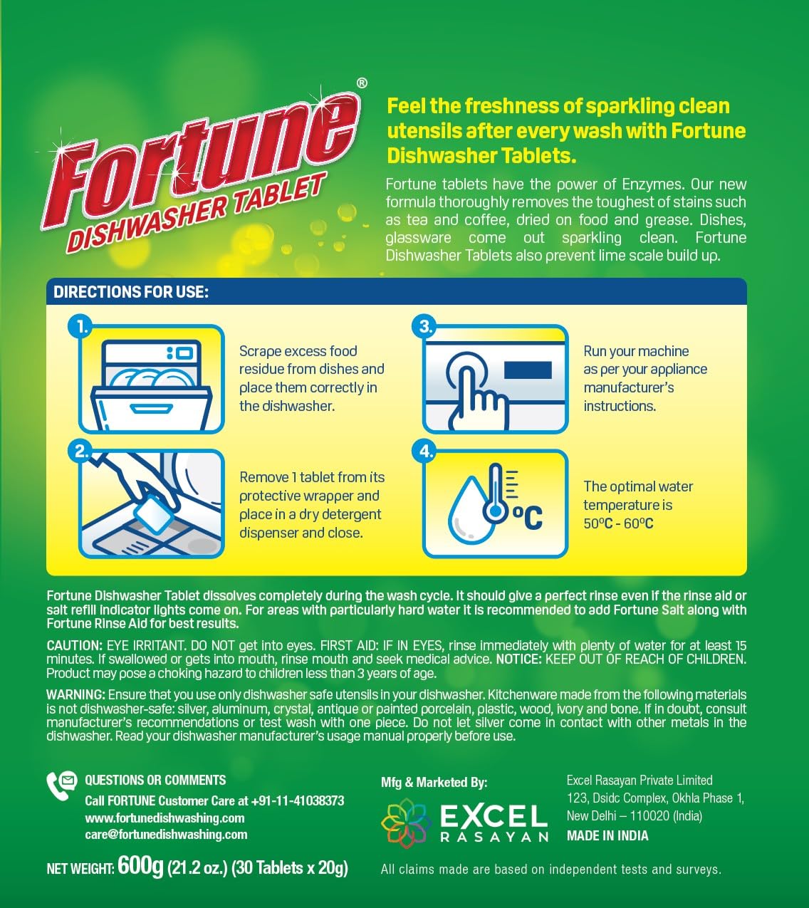 Feel the freshness of sparkling clean utensils after every wash with Fortune 5 in 1 dishwasher tablets. Now Fortune dishwasher tablets have the power of enzymes. Our new formula thoroughly removes the toughest of stains such as tea and coffee, dried on food and grease. Dishes, glassware come out sparkling clean. The Indian style of cooking is a lot different from western countries. Our products are specially made for India. Fortune dishwasher tablets also prevent build up of lime scale.