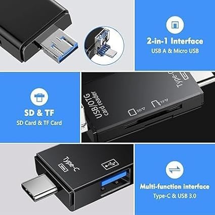 The FOTOKINA 6-in-1 OTG Card Reader is the ultimate solution for fast and convenient data transfer. Designed with USB Type-C, USB 3.0, and Micro USB connectors, this reader supports multiple devices including smartphones, laptops, tablets, and PCs. Compatible with a wide range of memory cards such as TF, SD, SDHC, SDXC, MMC, RS-MMC, and Micro SDXC, it ensures you can easily manage and transfer files from cameras, drones, dashcams, and more. With USB 3.0 high-speed transfer, you can quickly move photos, videos, and documents without lag. Its compact and portable design makes it the perfect tool for travelers, photographers, and professionals who need reliable performance on the go.