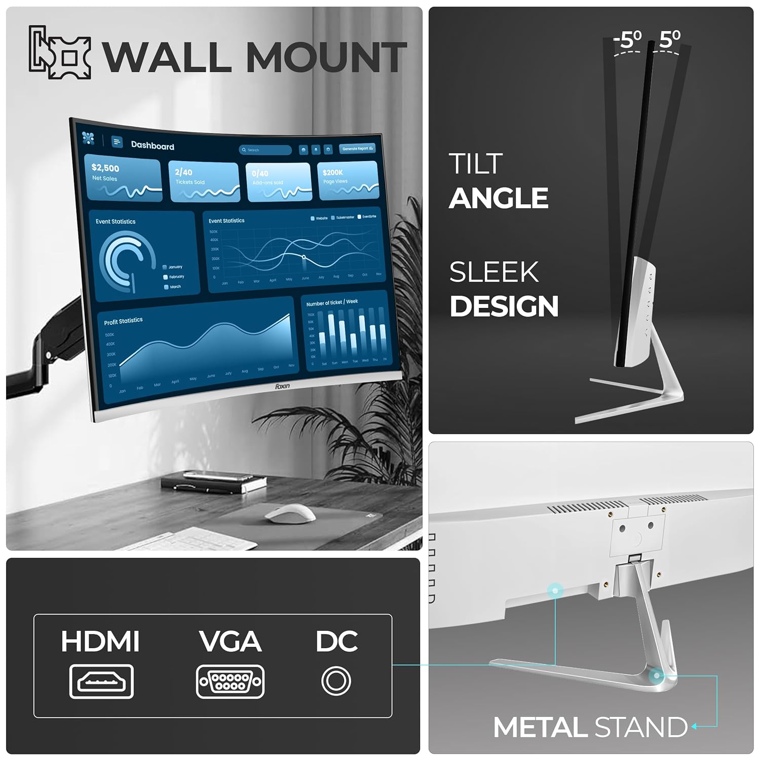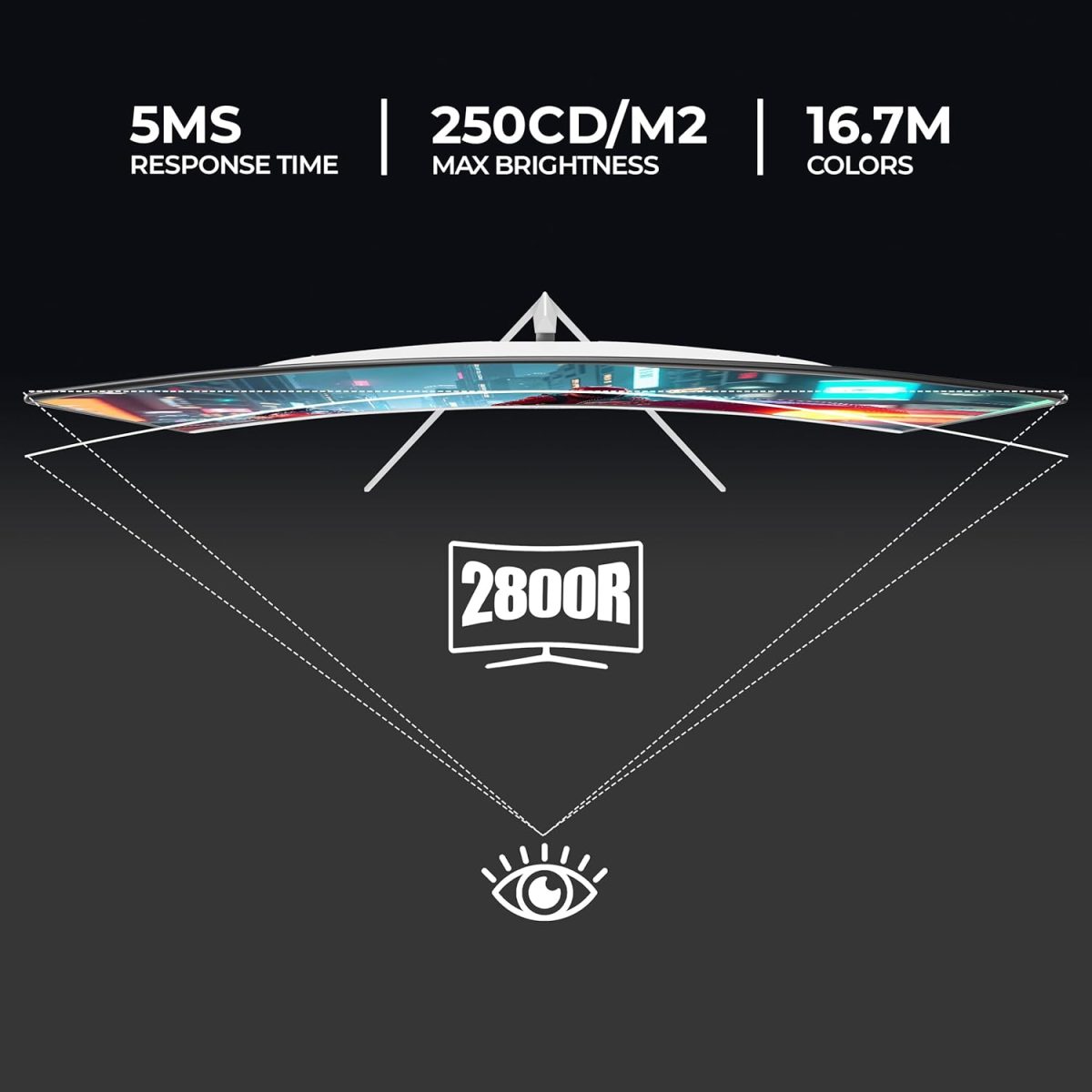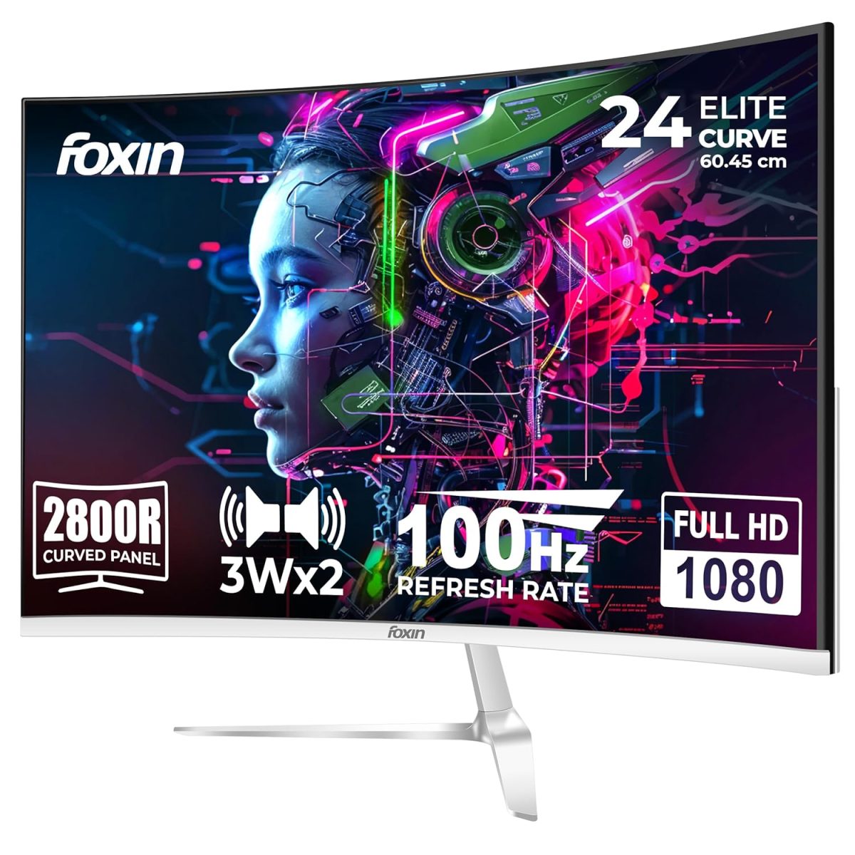 Foxin Elite 24 Inch Curved LED Monitor | FHD 1080p, 100Hz Frameless & Anti-Glare | HDMI & VGA | 5ms | Wall Mountable | 2800R Curve | Curved PC Monitor for Gaming, Work | White