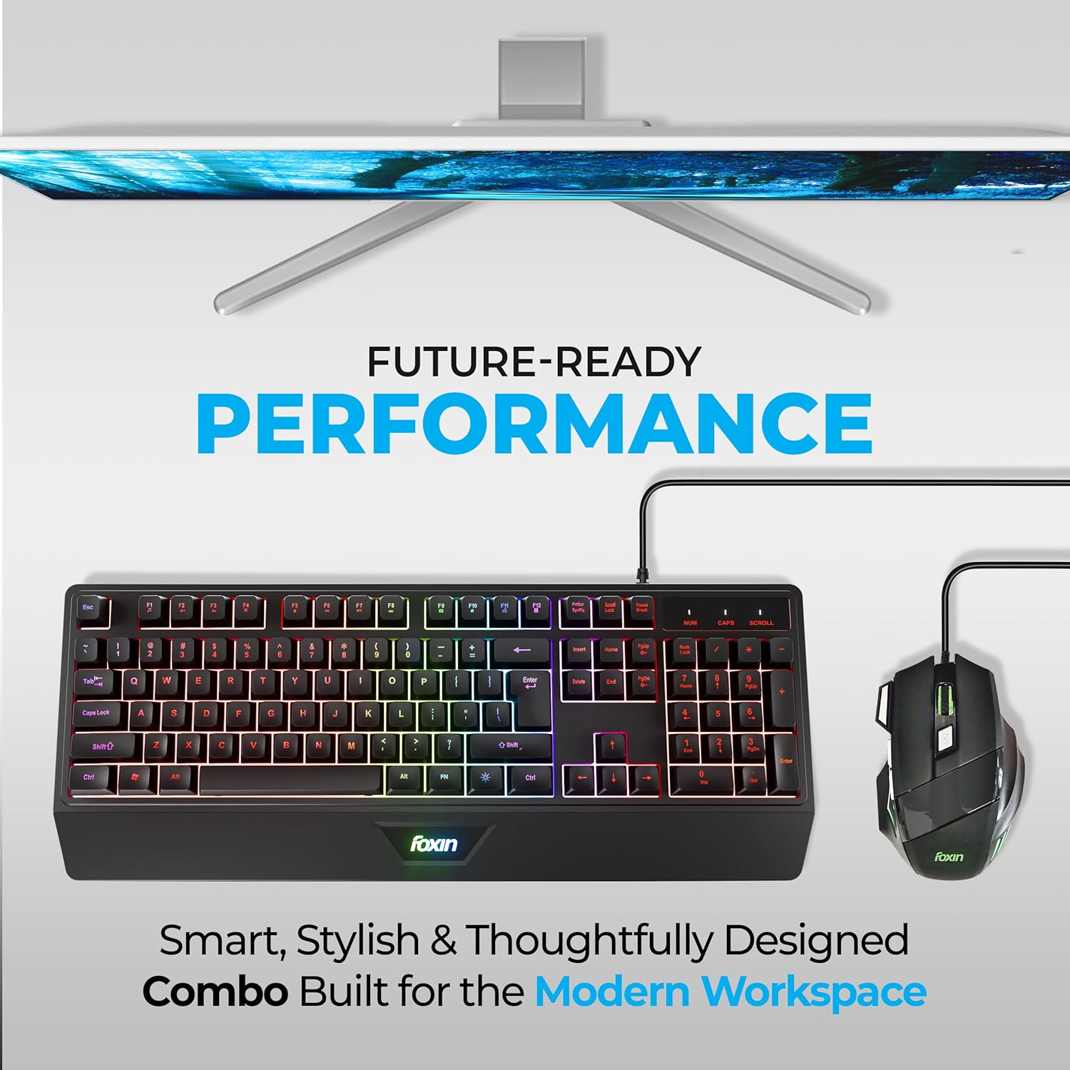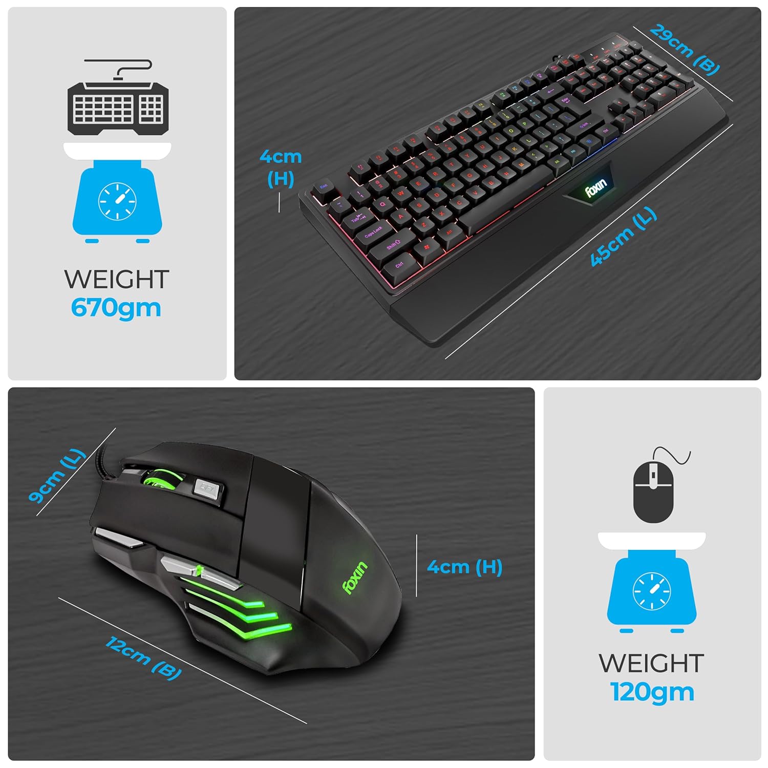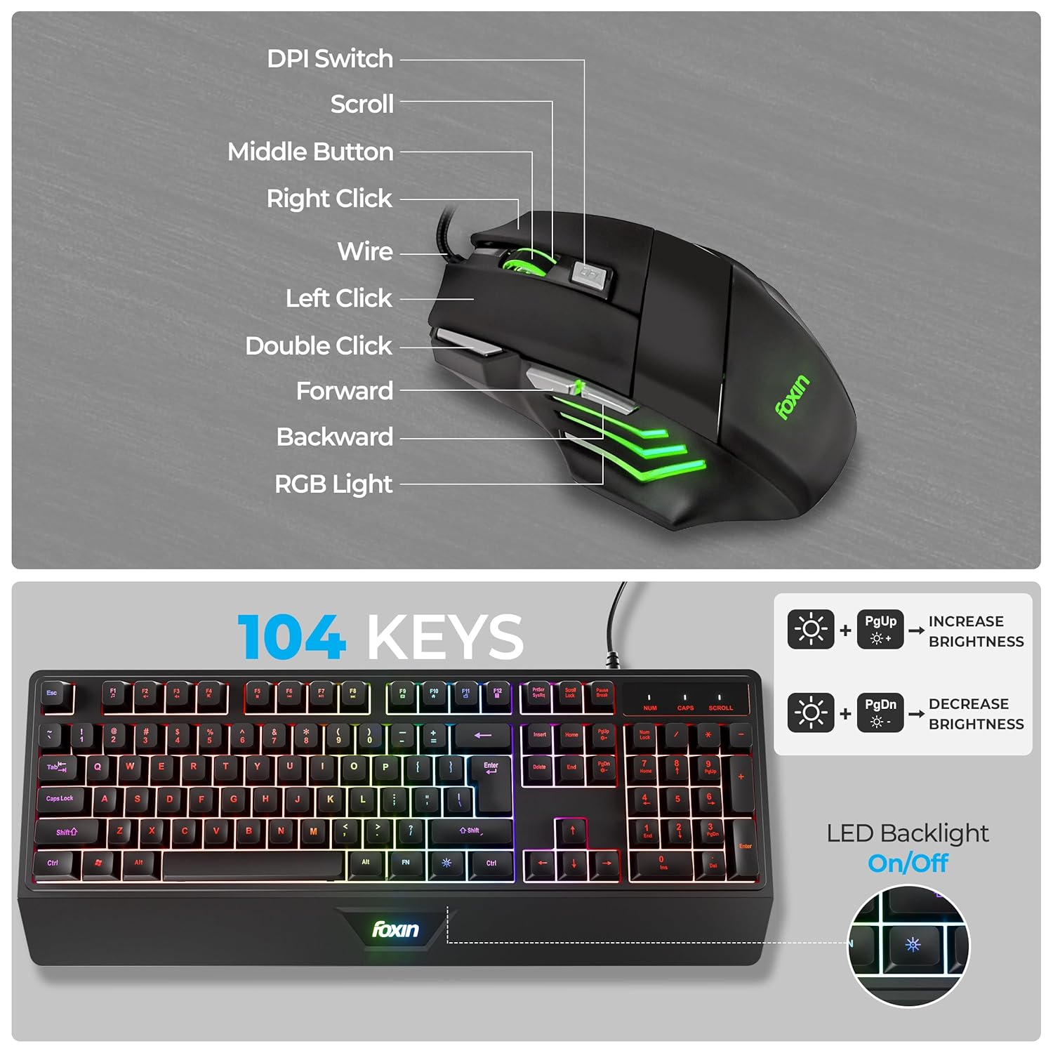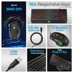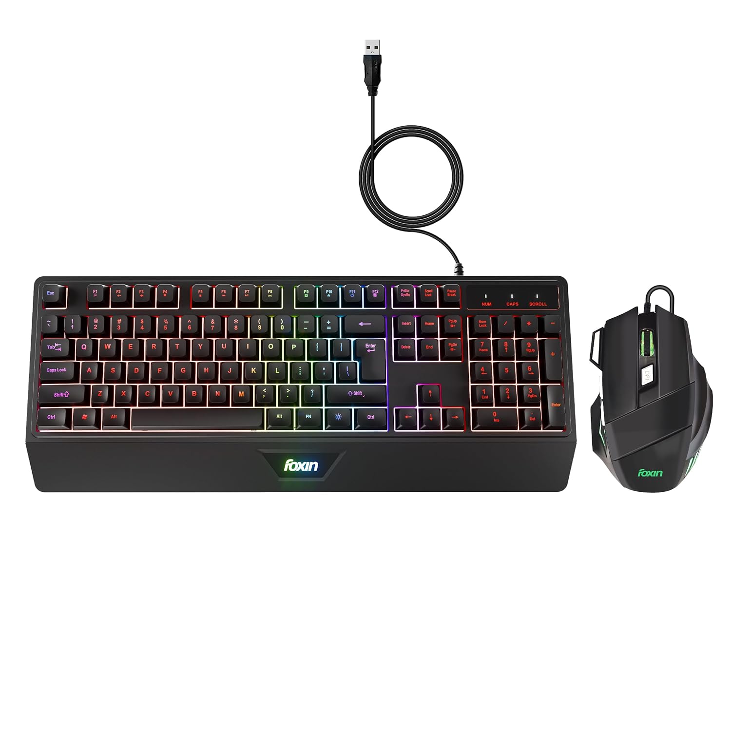 FOXIN Endeavour Gaming Keyboard and Mouse Combo Wired | RGB Rainbow Backlit Keyboard with 104 Keys & Wrist Rest | 3600 DPI | 7 Button Mouse | Plug & Play for PC, Laptop, Desktop