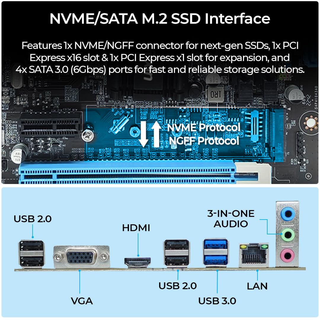 LGA 1151 Socket with H110 Chipset: Supports Intel 14nm i3/i5/i7 CPUs from the 6th, 7th, and 8th generations for stable system builds. Dual Channel DDR4 RAM Support (Up to 32GB): Enables smooth multitasking and performance with 2x16GB DDR4 modules. NVMe M.2 Port + 4x SATA 3.0 Slots: Provides lightning-fast storage access and versatile expansion for SSD/HDD. Modern Connectivity Ports: Includes HDMI, VGA, USB 3.0, USB 2.0, Ethernet LAN, and HD 6 Channel Audio—perfect for varied configurations. 730-Day Warranty & Durable Build: Built to last, this motherboard delivers long-term reliability for PC users and gamers alike.