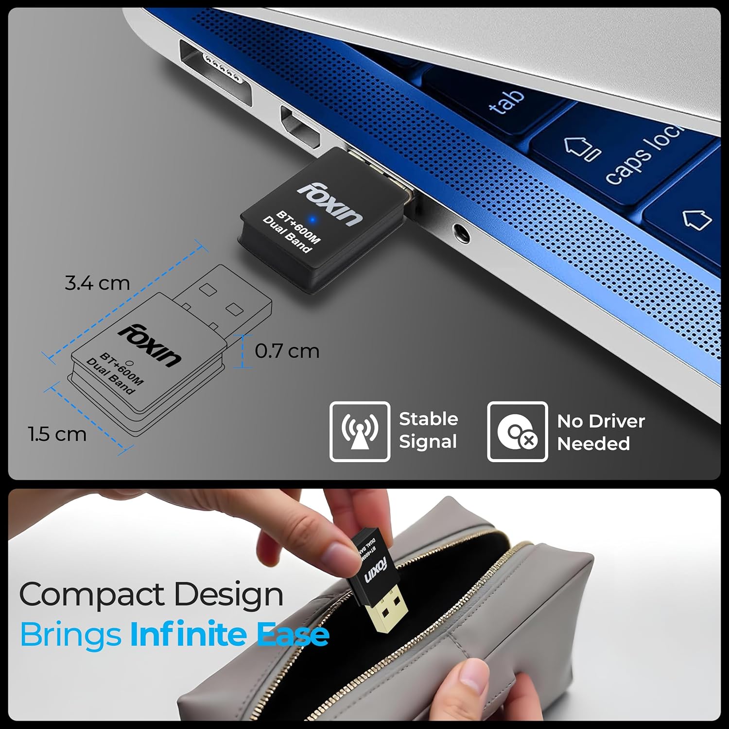 Foxin Nano 600 Mbps Dual Band Wireless USB 2.0 Wi-Fi + Bluetooth 4.2 Adapter for PC, Desktop, Laptop | Mini WiFi Dongle Compatible with Windows, Mac & Linux | WPA/WPA2 Security | 10-20M Range