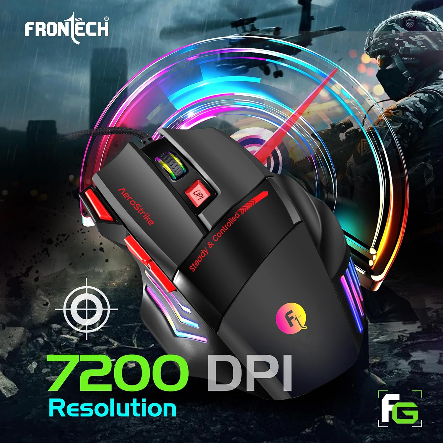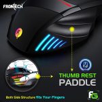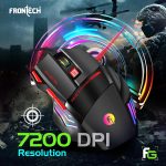 The Frontech AeroStrike Gaming Mouse is a wired gaming mouse designed for performance and comfort. It boasts a high-resolution optical sensor with up to 7200 DPI for precise tracking, and a dedicated “Fire Button” for rapid, continuous clicks, enhancing your in-game efficiency. Its ergonomic, non-slip design with a thumb rest paddle ensures comfortable extended use, while the vibrant LED RGB Rainbow lighting adds a customizable aesthetic. Built with a durable 1.5-meter braided USB cable and featuring multiple programmable buttons, the AeroStrike provides gamers with the control and reliability